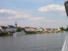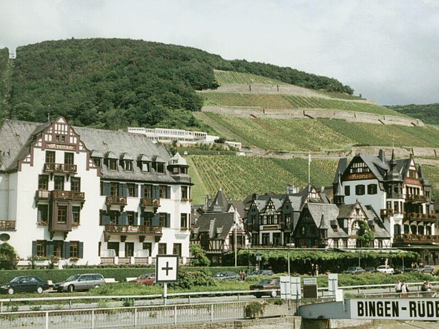 Thursday, 24 August. We left Frankfurt right after breakfast, drove down the north shore of the Rhine. I hadn't checked the map carefully and didn't realize until too late that there were no bridges across the Rhine until long after we had to head west toward Trier. Fortunately, there was a ferry at Rudesheim, probably the most popular town of the Rheingau wine area. The ferry ride provided a relaxing interlude and took