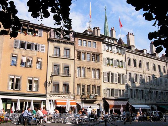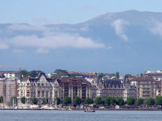 "pain" (bread). Finally, a multilingual German tourist helped us out. We stopped for the night in Morez, a small town in the French alps about 30 miles before Geneva. We took a walk around the town, bought a couple bottles of French wine to take home, had dinner at the hotel, and went to bed.  Central Geneva on the lake |  Bourg de Four Square |