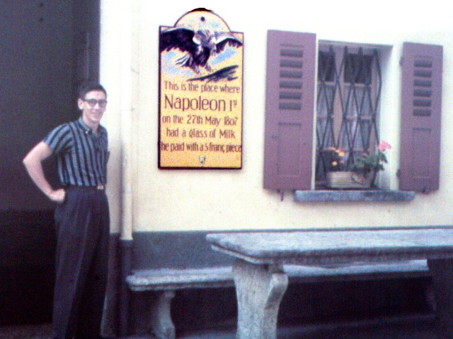 It was a terribly hot day for driving and the old Pontiac had no air conditioning. We stopped at a little village for lunch and had trouble with the language when Sharon wanted a sandwich. I remembered the words for "meat" and "bread," and we got the meat with no problem. But the owner could not understand my pronunciation of
