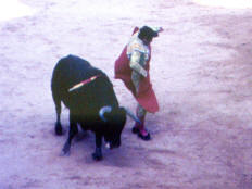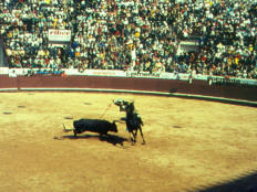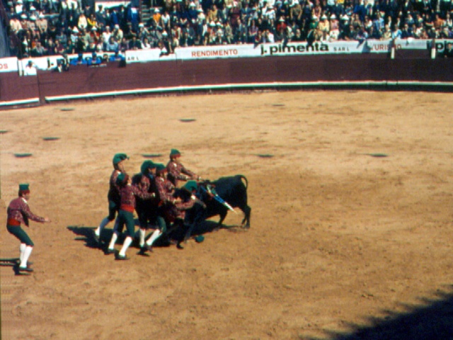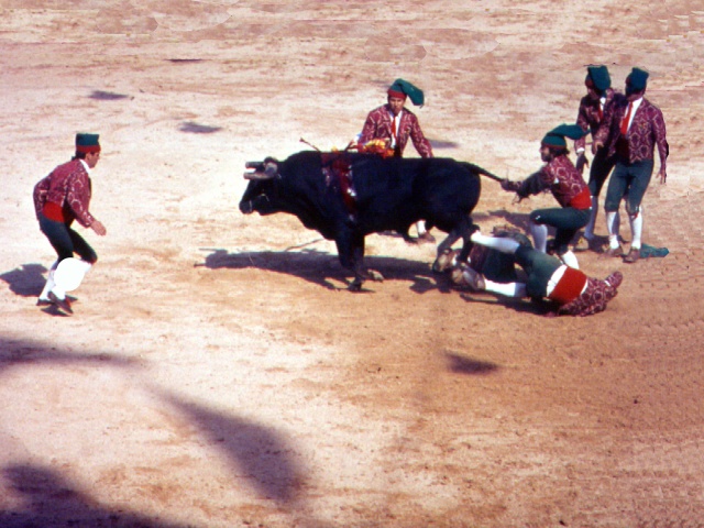 Next, several men on foot (forcados) lined up in a row in front of the bull and absorbed his charge until their combined weight actually stopped the bull. As the bull weakened (mostly from the banderillos), the forcados twisted its horns and once even forced it to fall to the ground. In the next stage of the bullfight, two men on foot (toureiros or matadores) took turns fighting the weakened bull with cape and sword, but only made a symbolic “kill.”