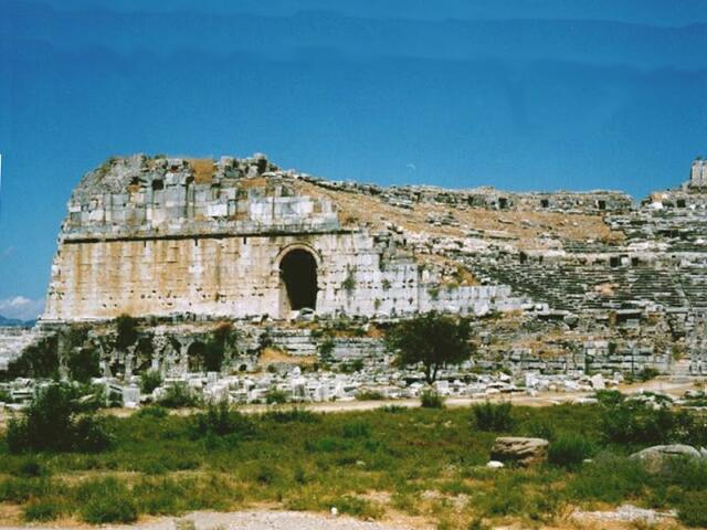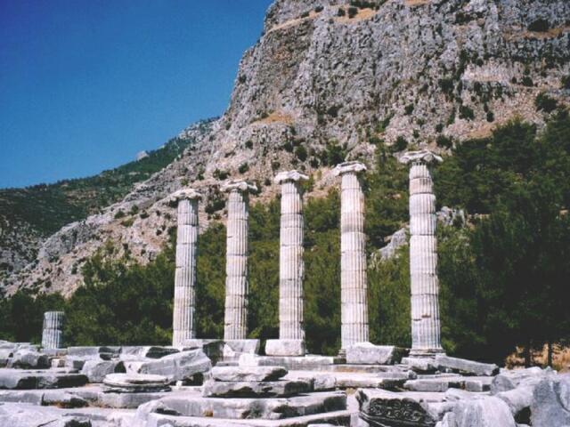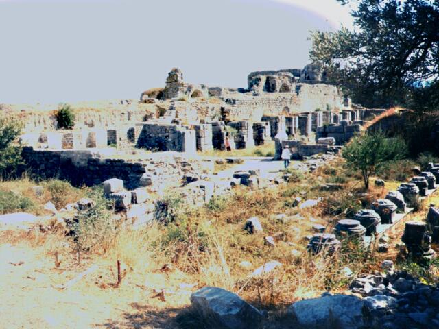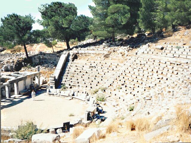 Page 1 2 3 4 5 6 7 8 9 10 11 12 13 14 15 16 17 18 19 20 21 22 23 Monday, October 2: After breakfast at the hotel, we left Selcuk about 9:00. We stopped to see the Artemision in the sunlight. We decided not to visit the so-called "House of the Virgin Mary" partly because of the press of time, but also because we did not believe it really had any connection with her. (It was built in 1950, supposedly on the foundation of a 1st Century house, but Pope John Paul II visited it in 1979, thereby giving it some level of recognition.) We bypassed most of Kusadasi and continued south to Priene. It was described in our guidebook as "one of the best preserved Hellenistic cities in the world," with streets laid out in a perfect grid. It turned out to be a disappointment. There was little to see beside a sparsely restored Temple of Athena, a small theater (both 4th Cent. B.C.), a couple of narrow streets (straight, but not enough to be called a grid), and lots of rubble and foundations. Built on a mountainside in the 12th Century B.C., Priene never had more than 5,000 inhabitants. Its claim to fame is that Alexander the Great stayed there for a time and financed construction of the Temple of Athena. We continued south toward Miletus. It was farther than we expected and we thought we might have taken a wrong turn. We saw a group of boys from the migrant cotton picking families, and I stopped to ask if we were on the right road. They held out their hands, asking for money and acting like blathering idiots, so we drove on. Because we were in a very flat area between the mountains and the coast, we finally were able to see Miletus, still in the distance. After parking the car, we started to enter the ruins. Several gypsy boys kept confronting us, laughing and holding their fingers around their eyes (like glasses) and saying what sounded like "occhi" (Italian for "eyes"). We think they were joking about the evil eye. The ruins were not very impressive. Like Ephesus, Miletus was once a seaport but is now five miles inland due to silting from its river (the Meander). That accounts for the flatness of the land between the city and the sea. Settled as early as 1400 B.C., Miletus fell under a succession of invaders like most of the ancient coastal cities. It reached its peak in the 7th and 6th Centuries B.C., founded many colonies, and was a leading center for art and science. It declined steadily after 500 B.C., however. The 25,000 seat theater was the most massive surviving structure, the one we had seen from miles away (because the land is so flat). The Faustina Baths, the largest in Anatolia, are recognizable but not too well preserved. We also saw the Ilyas Bey Mosque (14th Cent.), in fairly good condition. There were a number of other ruins across the huge agora, but we were tired and had seen too many better ruins recently. The site would have been more attractive if it still had the massive city gate that now stands in the Pergamon Museum in Berlin. We had seen it there in the early 1970s. It was after 1:00 and we were a long way from any town, so we had lunch at one of the two restaurants at Miletus. We were getting smarter about not overeating at lunch, and we just had a couple of meses. We headed back north to Kusadasi, stopping at Diana Travel to check on ferry arrangements. When we said we wanted to be within walking distance of their office in the morning, they referred us to a pension ($20 with breakfast) just up a street so narrow Jane thought it was a pedestrian walk. Although conveniently located, this turned out to be the poorest accommodations we had on the entire trip. After unloading everything at the pension, we returned the car to Avis, glad not to have to drive any more in the city. We walked along the waterfront, then out the causeway to the restored Genoese fortress (1500 A.D.) on Bird Island. There was a great view back toward the harbor. Walking back to town, we visited the Karavansaray, built about 1613 as an inn for caravans, now beautifully restored as a fine hotel. Around the lovely fountain in the big courtyard where the camels once were kept, hundreds of high quality carpets were displayed for sale. One of the salesmen gave us the history of the building in great detail without once asking if we were interested in a carpet. (Those Turks are smoooooth!) Next, we went into the courtyard of the Okuz Mehmet Pasa Mosque (also 1613). We didn't go into the mosque itself because people were praying there. Back at the pension, Jane had an apple tea at the bar. We arranged for the clerk to wake us at 6:30 the next morning, then went to our room to rest (Jane) and sort our stuff and repack for the flight back (me). Later we changed and went out to celebrate our 42nd anniversary since we would be traveling the next day. It was windy and bitter cold, so we picked out a waterfront restaurant where we could eat inside. We picked two large sole from an aquarium for our main course. (The fish alone, sold by weight, cost more than our hotel, fish dinner, and breakfast at Assos!) We had a couple of meses, a salad, and the fish with red rice. The waiter fileted the fish at the table, just like they used to do in Italy in the early 1960s. We each had a half-liter Efes beer, and Jane had watermelon for dessert. We stopped by the Karavansaray again to see it by night. It was beautiful, with the edges of the building outlined with lights. We were freezing, though, even with our heaviest jackets, so we rushed back to our pension before 9:00. Page 1 2 3 4 5 6 7 8 9 10 11 12 13 14 15 16 17 18 19 20 21 22 23 |