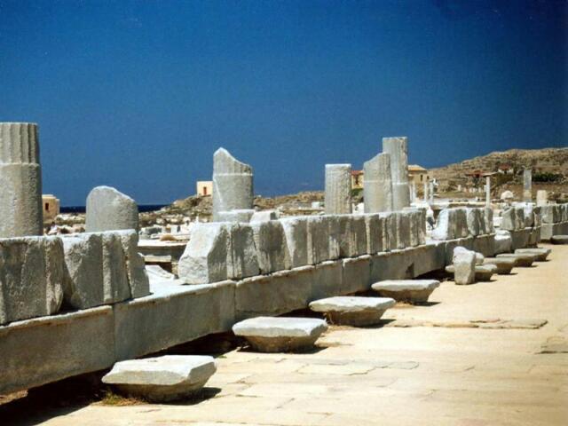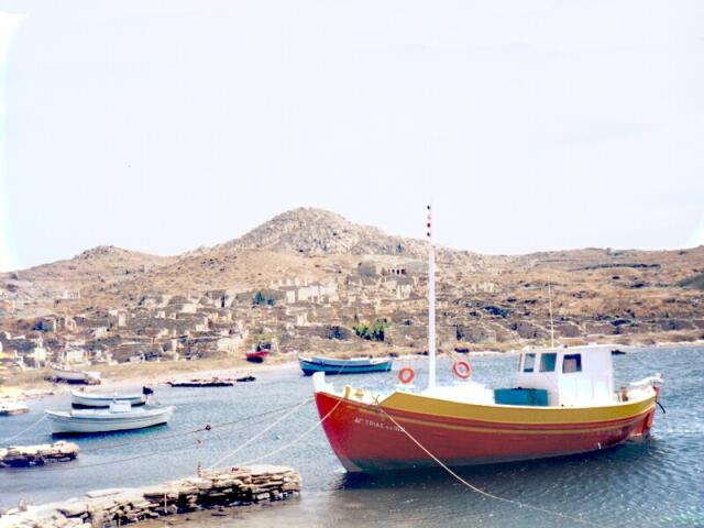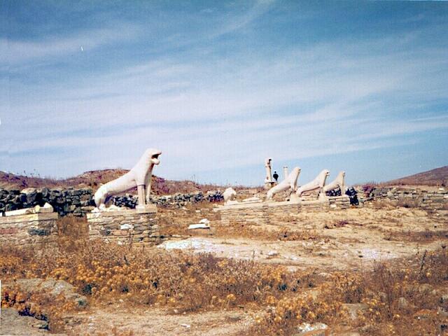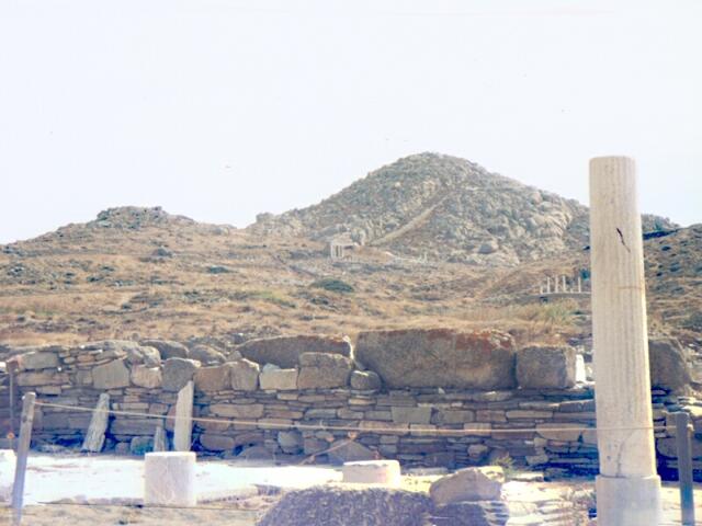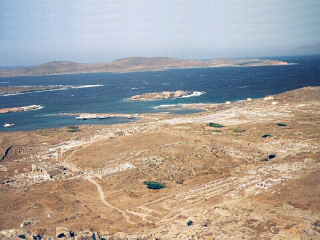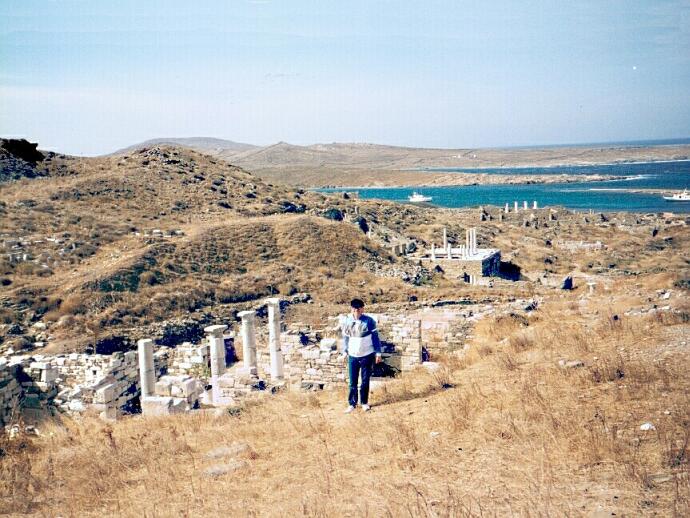 Page 1 2 3 4 5 6 7 8 9 10 11 12 13 14 15 16 17 18 19 20 21 22 23 Friday, October 6: We had breakfast at 8:00. This was our first Greek breakfast away from Ore's. It was basically the same as we had been served in Turkey except there were no cucumbers. We had boiled eggs, sliced sausage and cheese, bread with jam, tomatoes, olives, and coffee. We caught the 9:30 boat to Delos. It was a sunny day, but extremely windy. The sea was very rough, and the small boat pitched and rolled something awful. The advertised 20 minute trip took 40 minutes. The island was already occupied before 2,000 B.C. When the Ionians arrived about 1000 B.C., Delos became the center of a religious cult because, in Greek mythology, it was the birthplace of Apollo and Artemis (twins). Its central location in the southern Aegean also made it a major commercial center. Mikonos, by contrast, was just a stopping off point for people going to Delos. Now, of course, Mikonos is the big attraction, and Delos is uninhabited. On our arrival at in the Sacred Harbor, the captain shouted to remind everyone to be sure to be back by 12:30 for the return trip. There were ruins in both directions as far as we could see. We started north down the Sacred Way, lined with temples of Apollo. There had been some restoration, and many of the ancient roads had been uncovered. Most of the structures were barely recognizable, though, even with a guide book. We spotted steps leading up Mt. Kinthos, on the southeast side of the city, and we decided to climb to the top for the view. It was a rigorous climb; the steps were steep and uneven. The fierce wind only made it harder. When we finally got to the top, we had to hold on to rocks to keep from being blown right off the mountain. The view was terrific, though. Not only could we see the entire layout of the ancient city, we had a 360-degree view of the Cyclades ("around Delos"). We could easily see Mikonos, Tinos, and Siros, with Naxos and Paros dim in the distance. Heading back toward the harbor, we saw well-preserved mosaics in the House of the Trident and House of the Masks. The theater (capacity 5500) was recognizable but in poor condition. It was already close to noon, and we rushed back to the northern part of the ruins.