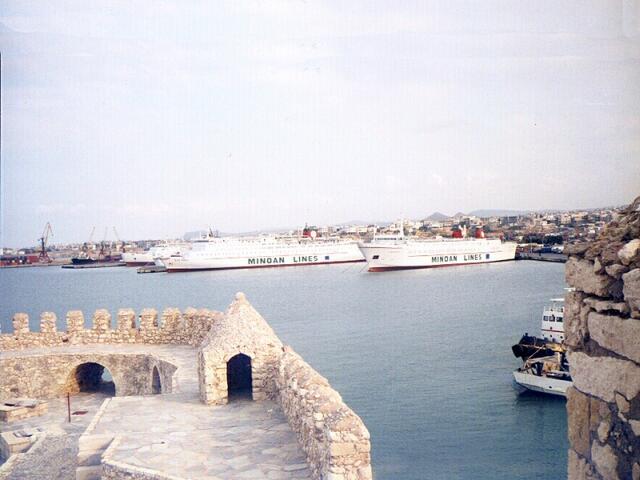 Page 1 2 3 4 5 6 7 8 9 10 11 12 13 14 15 16 17 18 19 20 21 22 23 Saturday, October 14: We were up at 7:30 and loaded the car for the last time. We drove into Agios Nikolaos for the "English breakfast" we had seen advertised at one of the restaurants on the lake. It consisted of two eggs, some half-cooked bacon, a thin wiener, cold baked beans, toast and coffee. It was a big breakfast, but it wasn't very good. We bought some fresh fruit at a produce store and headed back toward Iraklion around 9:45. It was a pretty, warm day. We got to the Archeological Museum in Iraklion before 11:00. Most of the artifacts found at Knossos and the other Minoan palaces are on display there. They also have the original murals from the walls. (Copies are displayed at the ruins.) We had been here, too, in 1973, but we couldn't remember any of it. It was very interesting. It was amazing how they had reconstructed large wall murals from relatively few parts of the originals. We finished about 1:30 and ate lunch at the museum. We left the car in the museum parking lot and walked the few blocks down to the harbor. It turned out there were plenty of places to park, so we had walked a lot for nothing. There was a Venetian Harbor here, too, though, larger and less picturesque than those at Rethimno and Hania. We saw the Venetian Arsenal and toured the 16th Century Venetian Fort, now completely restored. I walked out to the ferry dock and found out we could board at 4:00. (Jane was tiring fast.) We walked along the waterfront, stopped by the Avis office to be sure we could find it, then back to the car. I dropped Jane off at the ferry where she waited while I returned the car. When I got back (puffing from running the half mile back), we boarded about 4:40. Departure was scheduled for 7:15 p.m. The ferry was large, very modern and well appointed. After doing some exploring, we got settled in our cabin, then rested. Guess who got the top bunk. At 7:15 we went to the main lounge and watched as the ferry sailed. We were among the first to the dining room. It was a beautiful setting, like the most expensive restaurants. The prices were quite reasonable, though. Unfortunately, our waiter was very sullen. We had a Greek salad, roast veal with potatoes. Jane had fruit "compost" for dessert. The food was good, but everything had been prepared in advance and was brought to the table at the same time. (It's a good thing we didn't have soup or order ice cream for dessert.) We also had a bottle of Minos Castillo red wine. It was more than we normally would drink with dinner, but we polished it off easily. It was after 9:00 when we got back to our cabin, and we went right to bed. Page 1 2 3 4 5 6 7 8 9 10 11 12 13 14 15 16 17 18 19 20 21 22 23 |