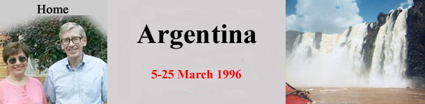 Introduction: We had been wanting to visit Argentina for many years, so this was one of the first overseas trips we started planning as soon as I retired. Our main goal was to visit Carlos and Norma Cerda', whom we had met about 30 years before. Carlos, an Argentine Army attorney, had come to the U.S. Army's Judge Advocate General's School in Charlottesville, Virginia, for a nine-month course, and I was his faculty advisor. We were both majors then. Norma had come to Charlottesville, too, and the families became fast friends. We had seen Carlos only a few times since then when he came to the U.S. on short visits. The Cerdas' kept urging us to visit them in Argentina, and now we finally were doing it. Carlos had helped me plan the trip. In the limited time available we would visit the Cerdas' in Buenos Aires. In fact, we managed to exchange for a timeshare apartment in the city. But we also planned side trips to Iguazu (tremendous waterfalls), Salta (a taste of old colonial Argentina), and the South Atlantic coast (near Mar del Plata). Tuesday, March 5: We left Massanutten and drove to Culpeper around 11:30. Our daughter-in-law, Julia, drove us from there to Dulles Airport. We got there at 3:30 for our 5:30 p.m. flight to Miami. We were flying to Buenos Aires on free tickets obtained through United Airlines' Mileage Plus frequent flyer program, and we'd received those tickets months before. We still had to get to the airport extra early, though, because we had to buy our special "Fly Argentina" tickets for Iguazu and Salta. We each were getting four coupons (enough for two round trip flights) for $450 plus airport taxes, about half what the flights would cost if we bought regular fare tickets. The flight to Miami was right on time. We had a light snack on the plane and arrived in Miami at 8:20. We killed time by exploring the huge airport. It seemed to have miles of empty corridors, but there weren't many people around at that time of night. We boarded the 11:45 p.m. flight to Argentina on time, but it didn't take off until 12:15 a.m. Wednesday, March 6: Dinner was finally served around 2:00 a.m. Then we get a couple of hours rest before a light breakfast was served. We landed in Buenos Aires at 10:00 (8:00 EST), so the flight took a little less than eight hours. We had a great view of the Rio de la Plata as we approached Buenos Aires. It was the widest river we'd ever seen, probably by a factor of ten. It also was very brown and muddy looking. Carlos met us, accompanied by a chauffeur, a secretary, and a porter. He took us to a small lounge where we sat and talked while his people took care of the immigration and customs formalities. We changed some money at the airport, although that probably was not necessary. The Argentine peso was pegged to the dollar, and dollars were accepted just about everywhere. It was a fairly long ride in from Ezieza Airport. As soon as we got into city traffic, it became apparent that the Argentines drove a lot like the Italians, paying no attention to the lanes painted on the road. That became really exciting when there was a monument in the center boulevard strip; the lanes curved around the obstacle, but the cars all went as straight as possible without leaving the road. As a result, as many as six lanes of traffic would crowd into the two inside lanes.
