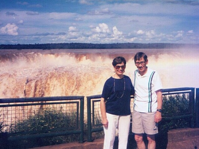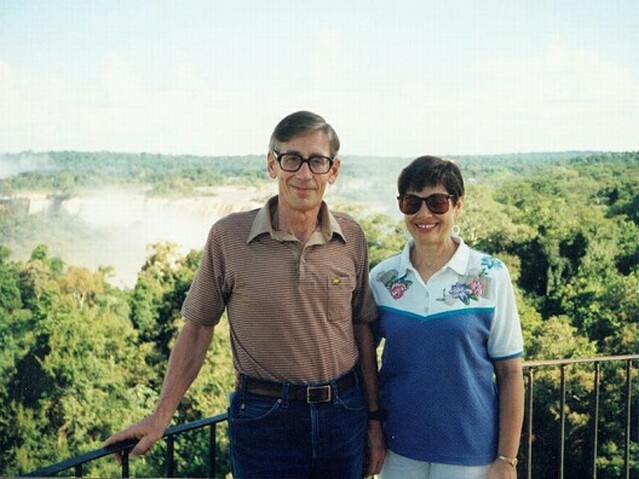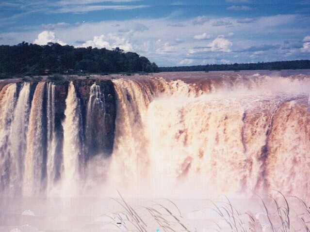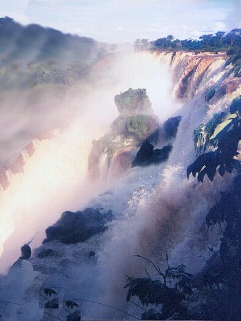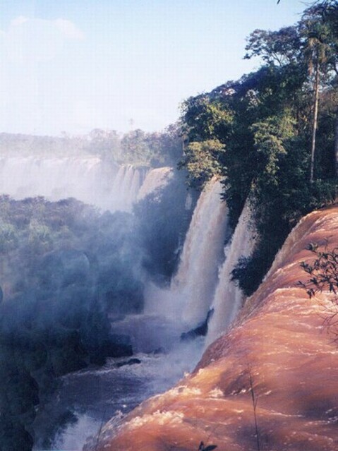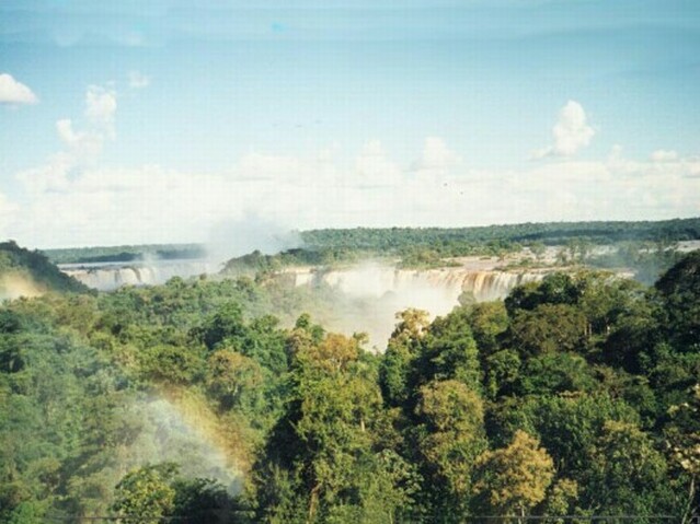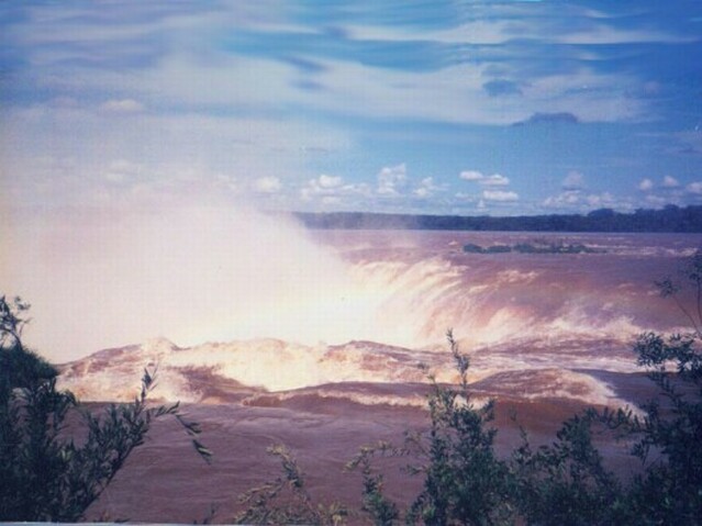 We walked back down to the end of the remaining paseo and took the boat back to Puerta Canoas. Wilson drove us to the entrance to the National Park, directly behind our hotel. From there we walked the Paseo Superior as it followed the lip of the falls for hundreds of yards. Again it was spectacular! At each section of the falls, there were foot bridges suspended only a few feet above the water just where it dropped over the edge. Some of the bridges were only ten yards long, others as much as forty. Between the bridges there were slightly higher points of rock that channeled the waters into individual falls. The rock was not barren, though. This was a rain forest, and there was lush vegetation everywhere. As we crossed one waterfall after the other, eventually we could see an endless wall of water running perpendicular to the falls we were crossing. Finally, we reached the end of the Paseo Superior, almost in the corner where the two sets of falls met. By now it was after six and we were very tired. We arranged to have Wilson pick us up at eight the next morning to try to get a Brazilian visa. We rested in our room for a while, then explored the hotel. Although beautifully situated, our hotel was the only facility for miles around, other than the few eating places clustered around the entrance to the National Park. They all closed by six. Our hotel was 11 kilometers from the nearest town, Puerto Iguazu. We found a travel agent on the lower level of the hotel and were able to get some information about available tours and activities. Among other things, we found that almost all of the tours started across the border in Brazil, in or near the town of Foz do Iguacu. We also found that Wilson's fees were two to four times as much as ordinary tours to the same places would cost. Of course, it was only to be expected that a tour would cost more with an individual guide and a private car, but we could have done without that luxury. However, we could not do without a visa for Brazil, and we knew Wilson was our only chance of getting that. We had dinner in the "informal" dining area, since Carlos had told us (wrongly) that coat and tie were required in the formal dinning room. It was a fixed price menu with a large buffet table of entradas, including various cold meats and fish. There was a choice between two main courses. Nonalcoholic beverages and a dessert were included, all for $24 a person. We both selected the cerubi' (a local fish) as our main course. It was very good. Sitting along the solid glass wall facing the falls, we could see that it had rained quite heavily a little earlier. It had stopped, though, so we were able to take a stroll after dinner. It was very warm and humid, but a beautiful night. We got to bed before 11:00, but were awakened during the night by a very heavy rainstorm. The falls were not going to run short of water. Page 1 2 3 4 5 6 7 8 9 10 11 12 13 14 15 16 17