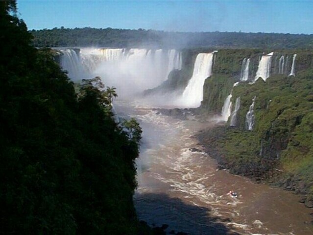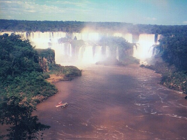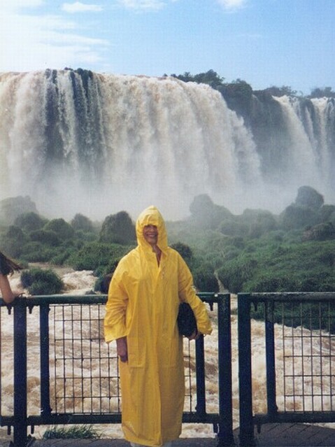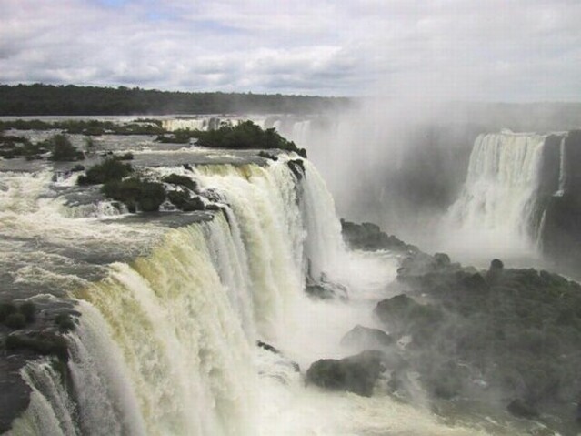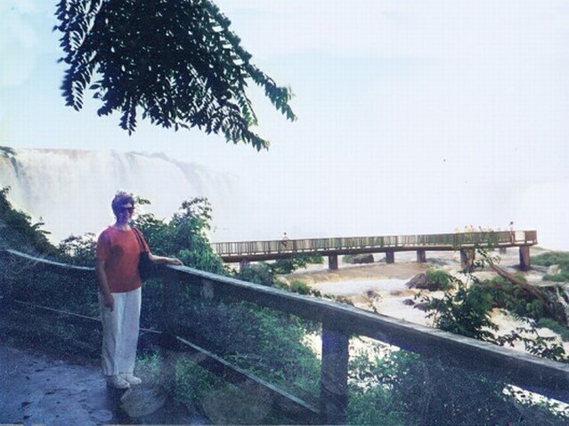 Friday, March 8: We had a nice breakfast buffet in the hotel, all sorts of breads, cold cuts, cheeses, and fruits - even scrambled eggs. And of course, fresh squeezed orange juice. Wilson picked us up at eight and drove us directly to the Brazilian Consulate in Puerto Iguazu. It was a tiny building and kind of shabby looking. Wilson spoke Portuguese, which may have helped. In any event, the Consul gave us applications to fill out. We then went with Wilson to have passport photos taken. We had the visas within 15 minutes after getting back to the consulate. Wilson charged us a total of $15 for taking us to the Consulate. That certainly was a bargain, although we all understood that, once we got the visas, we would have Wilson take us to view the falls from the Brazilian side for $40 each (versus $10 each for the same tour by bus). As we crossed the bridge over the Iguazu River between Argentina and Brazil, we could see Paraguay just a few hundred yards downstream where the borders of the three countries meet. Once inside Brazil, Wilson took us to the Cataratas Hotel, a beautiful colonial style building we could see from our hotel across the river. It had an impressive location, but there was no view of the falls from any of the rooms. Then we took the walk along the river, looking across at the Iguazu Falls on the Argentine side. Although the falls had been spectacularly beautiful from the Argentine side, there was an entirely different perspective from Brazil. We could see much wider vistas of the falls at one time, although never the entire falls. They could be seen in three main groupings. Just opposite the Cataratas Hotel were the tremendous double falls (in two steps) curving around San Martin Island. A little further along, there were several single falls one after the other. Finally, we came to the Devil's Throat.