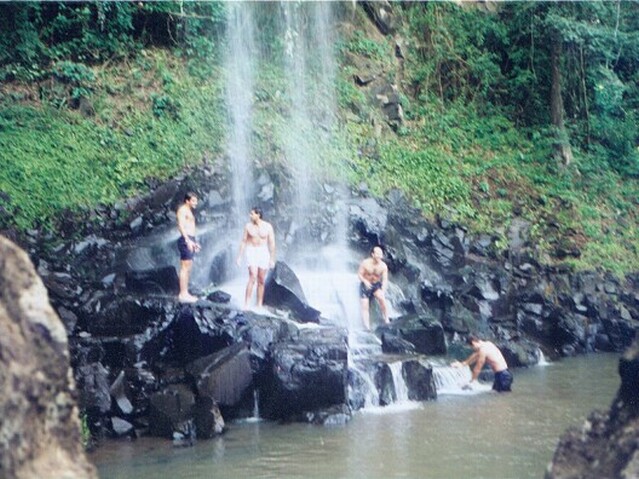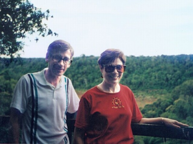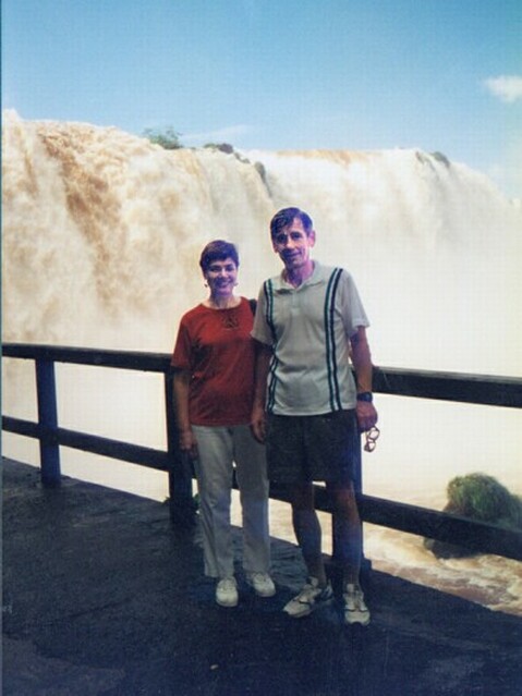 The walk had been descending gradually as we went in that direction and, by the time we got to the Devil's Throat, we were only a few feet above the river. At that point there was a walkway out into the river and nearly to the center of the Devil's Throat. The spray was very heavy, so Jane rented a yellow rain slicker to walk out there. I declined and got soaking wet. From the walkway the view of the Devil's Throat was awesome, although it was difficult to keep one's eyes open in the face of the heavy spray. Of course, it was impossible to take any pictures. The view downstream from the walkway was quite spectacular, too. From the bank, we also got some excellent shots of the one waterfall inside Brazil. In the souvenir shop at the end of the walk, we finally found the postcard we had been looking for, with an aerial view of the falls. We bought ten of them. Wilson met us at the elevator back to the level of the road. He drove us to the Bird Park, which turned out not to be a National Park, as we had been led to believe, but a private bird zoo. We saw just about all the birds native to the area, but even more that were from elsewhere in the southern hemisphere, especially New Zealand. The toucans, with their giant bills, were the probably most interesting birds. The local parakeets came in many colors, too, and were larger than pigeons. There was one parakeet that knew Wilson and would pick a cigarette out of his pocket. We ate a light lunch at the Bird Park, then Wilson drove us back to our hotel. After resting a bit, we went down to the travel agent and signed up for the evening dinner and show in Foz do Iguacu, Brazil. We'd noticed that our hotel was supposed to have a tour to San Martin Island at 3:30, so we signed up. It turned out that the water was too high for the boat to land, and a walking tour to Macuco Falls was substituted. It didn't start until 4:00 and, of the nine participants, we were the only ones over 25. We walked nearly two miles down a jungle path to the top of the falls, then climbed a steep cliff to the bottom. The falls dropped into a small pool formed by a ring of rocks. It was like something out of "South Pacific." Most of the guys went swimming in the pool. We were worried about getting back on time to get ready for our evening out, so we started back. We hadn't gone twenty yards before we realized we weren't sure of what path to take. Finally, two of the guys joined us and walked back with us, only to find the others had taken a different route and beat us back. We were down in the lobby at 7:30 when the bus was supposed to leave. It finally left at 7:45. There were eight of us on the tour, including one Argentine couple and the Gonzales, a Mexican couple with two daughters around 20 years old. The bus made it as far as Puerto Iguazu when it had some kind of mechanical trouble. The driver dumped us on the street in a seedy part of town (the whole town looked pretty seedy) and drove off. About 15 minutes later he came back in a van and picked us up. When we got to the Brazilian border, there was another delay, some problem with the Gonzales' visas. That took a good half hour to straighten out. We finally entered Brazil at 9:05. Fortunately, the restaurant was not very far, and we were then in another five minutes. Of all things, it was an Italian restaurant. The food, served family style, was very good. Unfortunately, though, it was practically thrown onto the table in front of us, possibly because of our late arrival. We had tortellini in brodo, white lasagna, spaghetti, roast chicken, polenta, and a sorbet. As we ate, we discovered that the Gonzales all spoke English. They were a very charming family and all very attractive in appearance. And talk about a small world, the older daughter, Laura, is a student at the University of New Mexico where my cousin, Dick, is President.
