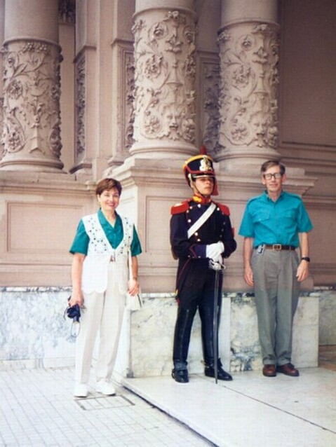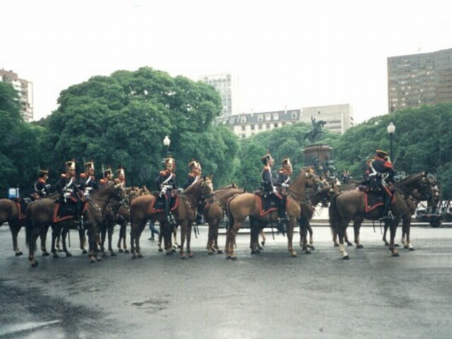 We walked down Florida Street all the way to Plaza San Martin where the Circulo Militar was. We cashed some travelers checks at American Express. By the time we came out, it was pouring. The street was filled with 18th Century-uniformed grenaderos on horseback getting ready for a parade, but the rain was forcing them to cover their uniforms with yellow ponchos.