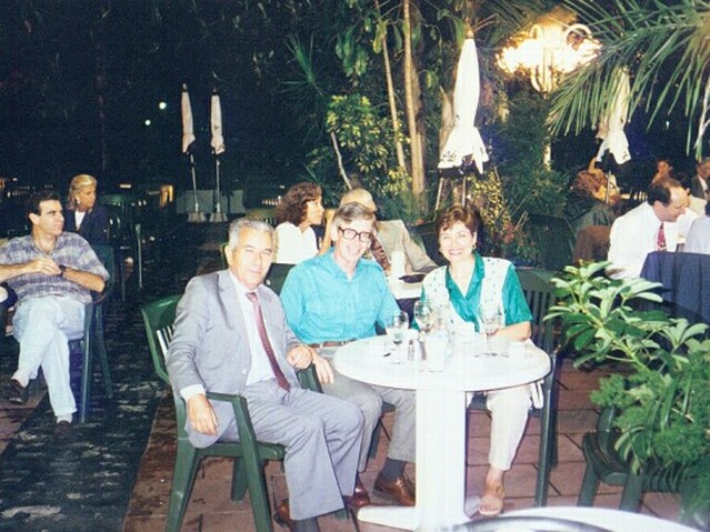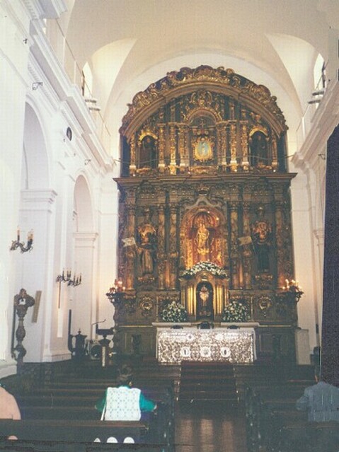 By this time it was raining hard. We ducked into a modern cafe, pursuadng Major Sola' to let us buy him lunch. Afterward he took us walking in the rain trying to find a bus stop. We finally prevailed on him to catch a taxi. The taxi fare to our condo was $1.90; it would have cost $1.50 on the bus - if we had ever found one. After resting for a while, we took a load of clothes to the laundramat on the corner, then explored the neighborhood while it was washed and dried. In addition to numerous little grocery stores, bakeries, cafes, and similar shops, there must have been more than twenty tapestry shops. Apparently this was the area where most of them were located. Carlos had Martinez pick us up at 6:45. We picked up Carlos at his apartment, then drove a short way to the Recoleta, a very elite neighborhood built around and named after the cemetery where the nation's heroes and other rich or famous people are buried. Carlos took us to the Basilica of Our Lady of Pilar, built in 1732, with a large altar of silver. We briefly walked along the wall of the adjacent convent, now secular and lined with elegant shops, cafes and restaurants. We had a coffee at the pricey Cafe de la Paix in front of the church.
