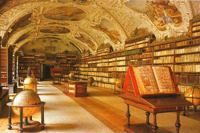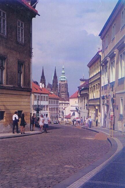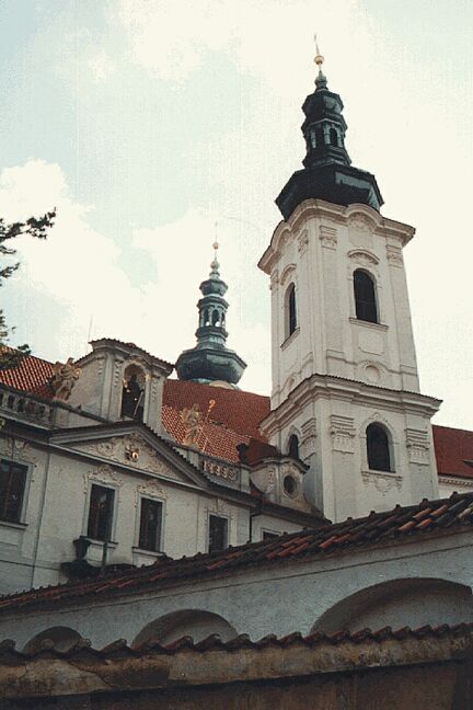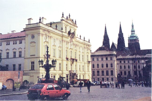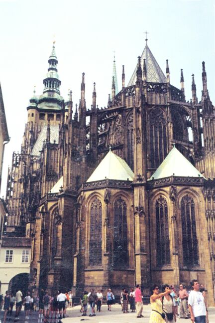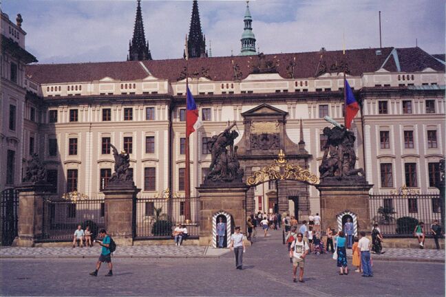 Brno is the capital of Moravia, one of the three provinces that make up the Czech Republic. (The others are Bohemia and Silesia.) We didn't see much of Brno since our restaurant was not in the heart of the city. As we continued on in the bus, Katie passed around apple juice and her favorite buffalo grass vodka. We finally got to the Diplomat Hotel at 5:45 p.m. Although today had been cloudy and "only" in the low 80's, we were happy to find that this hotel really did have air conditioning. We met Katie at 6:45 for the customary orientation walk where she showed us the nearby subway stop and bank. We had a buffet dinner at seven, then sat around the dining room talking until almost 9:00. Thursday, 23 July: We woke up to another warm day. The breakfast buffet at the Diplomat was somewhat better than those in Poland. The bus left for the city tour at nine with a local guide who filled us in on Prague's history. Like Krakow, Prague is a very old city. It was founded in the 9th century and was the capital of Bohemia when that was an independent country. In the 14th century the city experienced unprecedented prosperity when the King of Bohemia became Holy Roman emperor as Charles IV and chose Prague as capital of the Empire (1355-1378). Although Bohemia lost its importance when it was absorbed into the Hapsburg's Austrian Empire in 1526, Prague had a resurgence when Emperor Rudolf II moved the capital there from Vienna (1576-1611). In 1918 the city became the capital of newly independent Czechoslovakia. Prague suffered little damage in World War II and has retained much of its original appearance, with narrow streets and many historic buildings in the Gothic and baroque styles. Many of the old palaces now house government offices and foreign embassies. The old center of Prague consists of five sectors. Old Town (Stare Mesto), New Town (Nove Mesto), and Josefov (former Jewish ghetto) are on the eastern bank of the river. On the western bank are the Lesser Quarter (Mala Strana) and Castle Hill (Hradcany). Our "city tour" by bus turned out to be more of a walking tour of Castle Hill. The bus took us to a point on the hill above the castle so we wouldn't have to walk uphill. From this point we had an excellent view, not only of the castle, but also of Old Town directly across the Vltava (Muldau) River. Our first stop on the tour was at the early 12th century Strahov Monastery. We saw the two main rooms of the library, Philosophy Hall and Theology Hall. They were strikingly beautiful. We also saw the monastery's ornate Church of St. Roch. As we walked down the narrow old streets, we stopped outside the Loreto of Prague, a 17th century Capuchin church. The name intrigued me because my Irish ancestors in Wisconsin attended a little church known as Our Lady of Loreto, and I had never heard that name before discovering that. However, there was no time to explore that now. As we approached Prague Castle we passed several palaces just outside of it, including Sternberk Palace, site of the National Gallery, and the Archbishop's Palace next door. There are several more palaces inside the castle. Prague Castle was the residence of Czech kings from the 10th century. The guide led us through Mathias Gate (1614), and we passed through two huge courtyards.