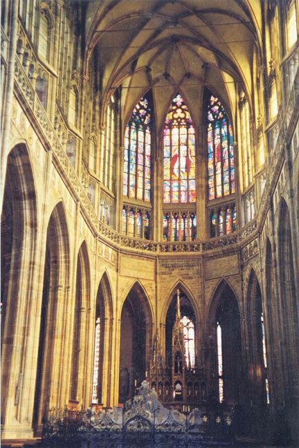 In the second was the modern-looking entrance to the offices of the President of the Republic. Entering the third courtyard, we came upon St. Vitus Cathedral, supposedly started by St. ("Good King") Wenceslas in the 10th century as a small chapel to house relics of St. Vitus. Our guide showed us the elaborate St. Wenceslas Chapel, one of the oldest parts of the present church, as well as the royal tombs.