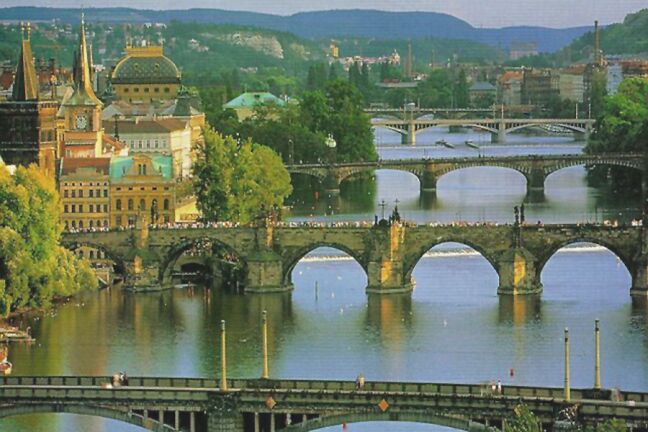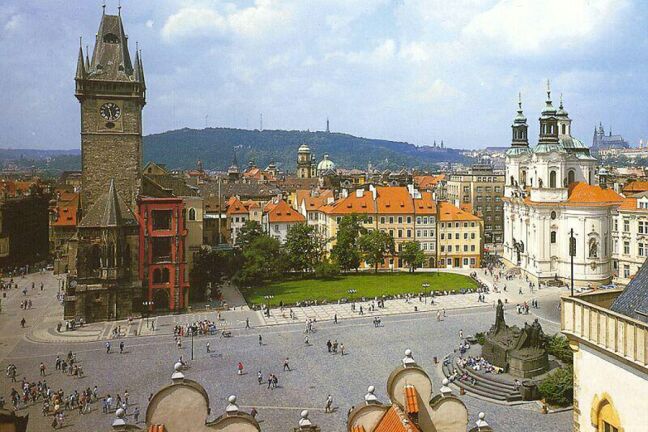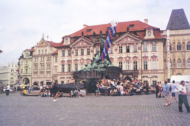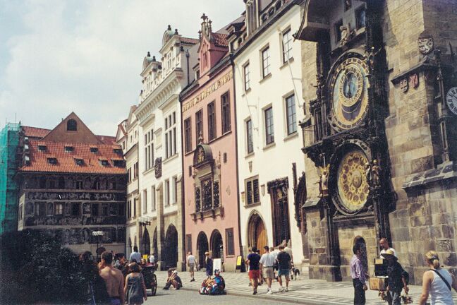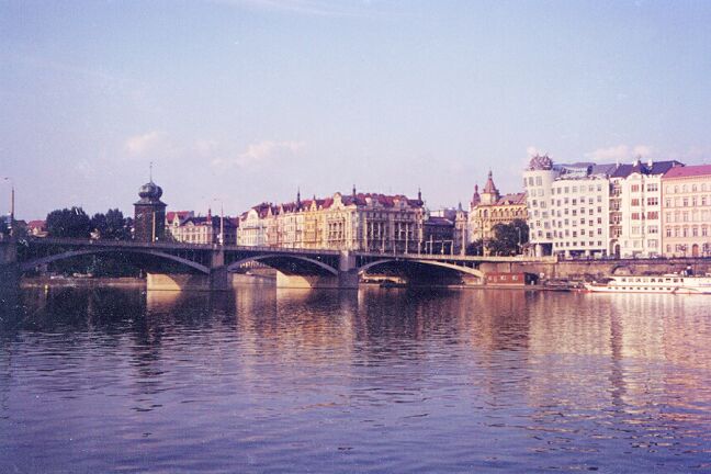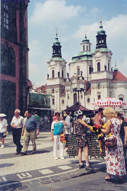 Moving down the third courtyard, we passed the old Royal Palace and faced St. George's Basilica and Convent. The foundations of the basilica date from the 10th century. [We revisited this area again on Saturday. See page 9 for pictures.] When the tour group reassembled, we all walked down Castle Hill, across Manesuv Bridge, and into Old Town Square, where we were turned loose. The picturesque square is surrounded by medieval buildings. Most prominent is the late 14th century Church of Our Lady before Tyn (sometimes called Tyn Church). Although the church faces and looms over the square, it is not on the square. It's lower portion is obscured by smaller buildings, and it's only entrance looks like part of the many shops lining the square. Across the square from the church is the old tower of the old town hall. (The old town hall itself was destroyed in World War II and the offices are now housed in what appear to be four distinct buildings adjoining the tower.) The tower is renowned for its astronomical clock (1490). As the clock strikes the hour, a window opens and each of the twelve apostles passes by, turns, and looks out. At the same time each of four figures on the outside of the clock moves in turn. The square in front of the clock is jammed with tourists at least 20 minutes before each hour. In the middle of the square is a large statue (1915) of John Huss, burned at the stake for heresy in 1415, but a Czech national hero. In and all around the square there were vendors either in stands under umbrellas or with push carts. I was intrigued by the large, comical hats (sold throughout the tourist area), but I couldn't figure out what I would do with it if I bought one. There were also the inevitable street musicians and mimes performing for tips. We had lunch (salads) at an Italian sidewalk cafe on the square. We were nearly finished when a German couple overtly began to covet our table. I invited them to join us, and we managed a little conversation in German. Walking down some of the streets off the square, we bought postcards and looked in the shops at Bohemian crystal, painted eggs, garnet jewelry, and whatever else was offered. Finally we caught the subway back to our hotel, arriving about 3:15 p.m. We cooled off and rested before getting ready for our evening dinner cruise on the Vltava River. The bus left at 5:30, taking us just across the Cechuv Bridge from Josefov (north of Old Town) where the river turns from north to east. We board a small boat that took us downstream through the heart of old Prague as we had a rather mediocre buffet dinner and were serenaded by strolling musicians. We passed through a lock below the Charles Bridge (1347), the oldest of the several bridges spanning the Vltava, and came to a "botel" moored in the river. Altogether, we passed under six bridges before our boat turned around and retraced its route, dropping us off about eight o'clock. The bus then drove us around so we could see some of the city by night. Our final stop was on a hill with a fine panorama of the city. We got back to the hotel about 8:40. Jane went up to the spa where she joined four Japanese women in the hot tub. From there she could see the St. Vitus Cathedral illuminated.