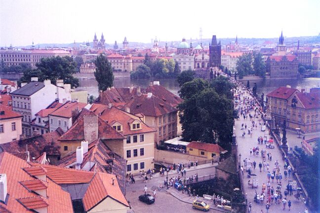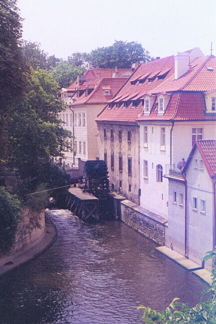 After riding back to the bottom, we walked a couple of blocks to the Church of Our Lady Victorious (early 17th century), home of the Infant of Prague statue that our little church (Holy Infant) back in Elkton, Virginia, is named for. The statue was brought to Prague from Spain in 1628 by a Spanish noblewomen who married a Czech king. It is displayed in a golden altar, always dressed in one of its 73 rich robes. The statue was much smaller than we expected (only 20"). From the church we walked the short distance to the west end of the Charles Bridge. I climbed to the top of the tower for a great view of the bridge and Old Town Beyond. Then I joined Jane on the bridge. We spotted on old water wheel in a narrow stream separating a small island from the west bank of the river.