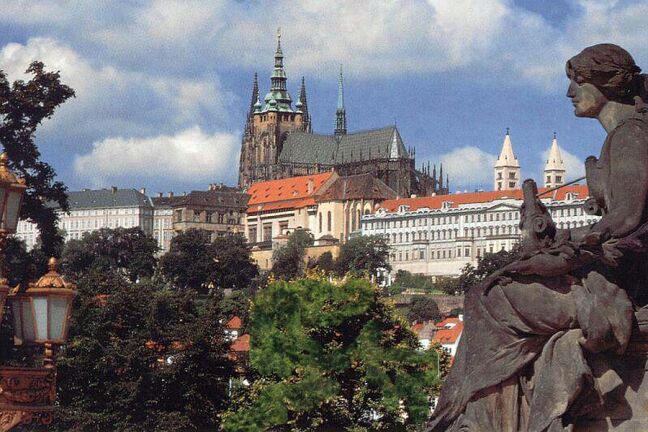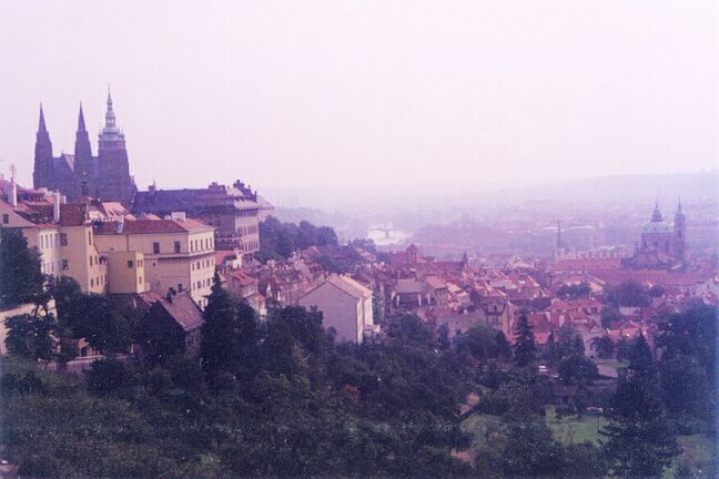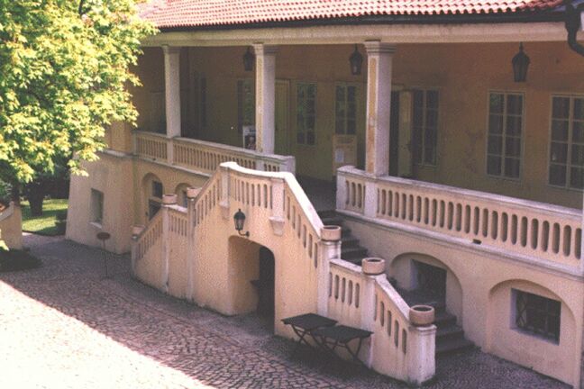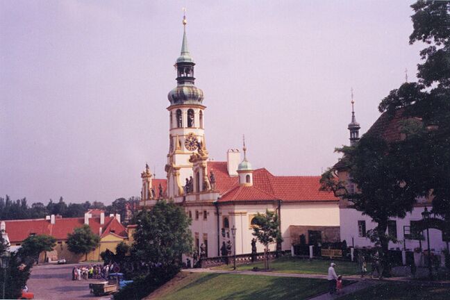 We exited the palace in the square in front of the Basilica of St. George. By luck, the guard was changing just as we emerged. Then we went into the old basilica. Although always described as dating to the 10th century, the original church was destroyed by fire and rebuilt in 1142. Showing its early origins, the interior was far simpler than in most churches, but it was beautiful in its simplicity. We also took a quick look into the adjoining convent. It was much larger, and far lovelier, than it appeared from the outside, with a cloister to rival that of any monastery. From Castle Hill we walked back to the hotel and got back just before 3:00. Jane had scheduled a 45-minute massage in the hotel's spa (cost: $20). I still wanted to learn about the Loreto, so I took off again. I found a way to combine the subway and a streetcar and get to the high point of Castle Hill with almost no walking. I walked down to the Loreto and entered the courtyard. I learned that there are numerous Loretos throughout the world. According to legend, the house in Nazareth where Mary was born, and later lived with the Holy Family after their return from Egypt, was moved by angels to Italy, to a hill called Loreto, in 1295. Replicas of the Santa Casa (bearing no particular physical resemblance to the original) are named for this site in Italy. The Loreto of Prague, when it was built in 1626, was a simple brick building, compatible with the legend. The inside remains much the same, but the exterior was later covered with elaborate stucco work depicting in relief various scenes relating to Mary. The buildings surrounding the courtyard where the Santa Casa is located contain five separate chapels and the main Church of the Nativity. The second floor houses the Treasury where precious gifts (mostly chalices, monstrances, and similar items) presented to Our Lady of Loreto are displayed. Finally sufficiently informed about the meaning of "Loreto," I headed back to the hotel, arriving about 4:30. Katie took us by bus at 5:30 for our dinner at the elegant Poet Restaurant in Prague Castle. We were caught in a brief shower as we got off the bus, the only serious rain we felt on the entire trip. The food was excellent, and the rain was long gone when we emerged at 7:15. Katie then took us to the Villa Bertramka for a play entitled "A Night with Mozart." Mozart lived in this villa during his two stays in Prague (1787 and 1791), and it was here that he composed the opera Don Giovanni. While waiting for the performance, we went through the museum housed in the villa. It was mostly period furniture and furnishings, but there were interesting pictures and a couple original scores written by Mozart. Back in the garden, we were invited into the music room by the actress/soprano playing Josefina Duskova, rumored to have been Mozart's mistress during his visits. The room was only about 30' by 30', making for a very intimate setting. The evening's program was not strictly a musical performance, although there was plenty of music. It was a reenactment of an evening Mozart spent at the villa in 1787, and was based on a contemporary written account by Josefina. According to her, Mozart wrote Don Giovanni that evening in just a few hours, after Josefina locked him in a room and refused to let him out until he finished it. (One suspects that he already had written most of it well before then.) All the dialog was in German but, with the aid of a summary in English, it was not hard to follow. The music, and especially the singing, was outstanding. After the performance, the bus took us directly back to our hotel. We got there about 10:00 p.m.