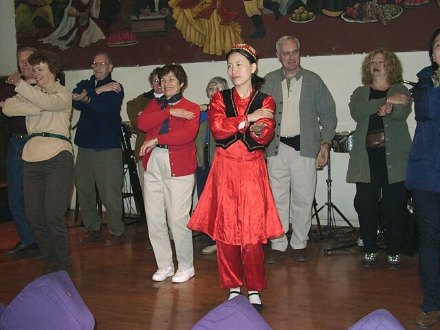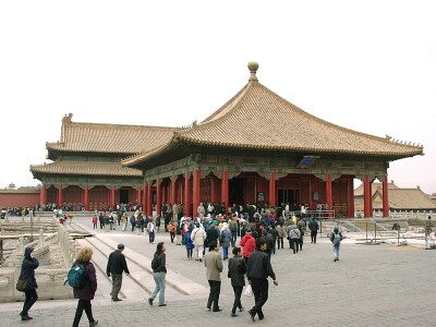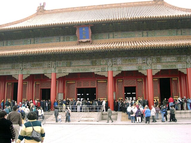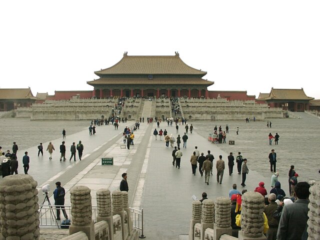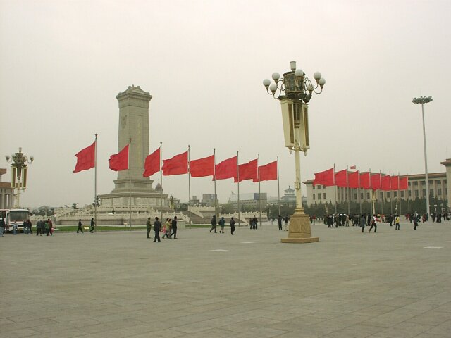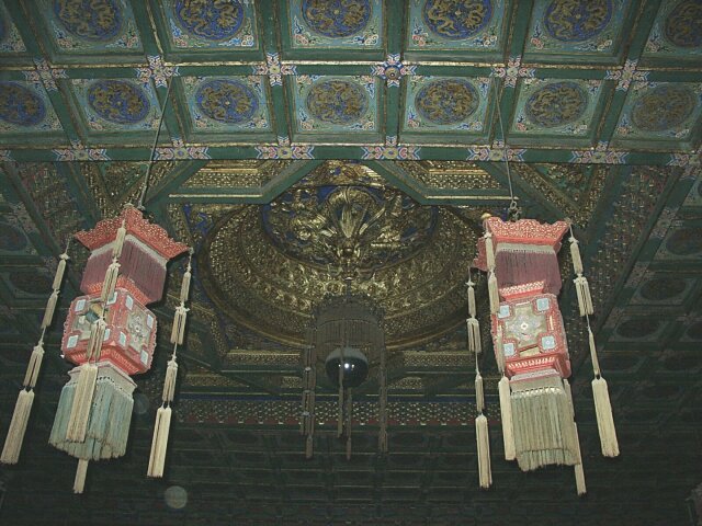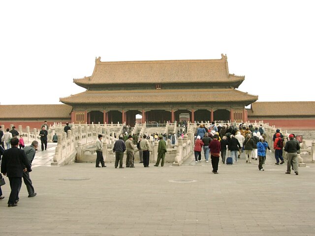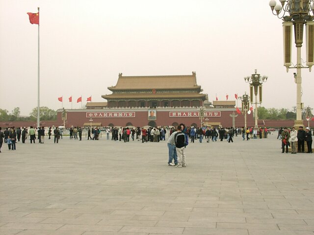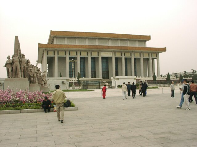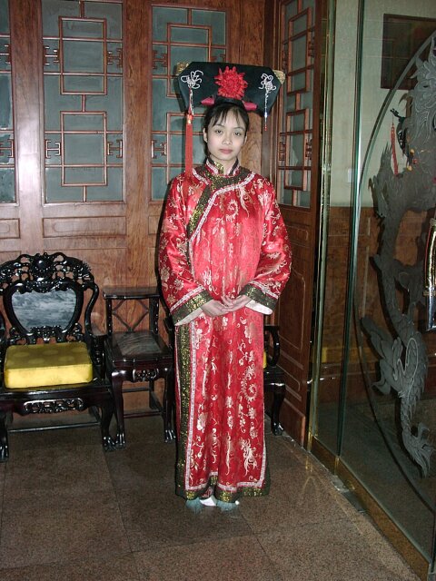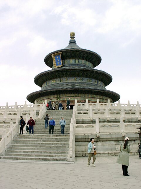 BEIJING Sunday, April 9. After a very generous breakfast buffet in the hotel, at 8:40 a.m. our bus took us to Tian An Men Square, only a couple blocks away. Mao had this huge square created in the 1950's by razing a large section of the 15th century wall of the Imperial City, leaving only the south gates (inner and outer) standing. Li had advised us to dress warmly, but no one realized just how cold it would be. The temperature was in the mid-40's, but the wind was steady at 40 m.p.h. with gusts of more than 60 m.p.h. In the huge Square, there was nothing to block it. We wandered around the area between Mao's Tomb and the Gate of Heavenly Peace (entrance to the Forbidden City / Imperial Palace), with the Great Hall of the People (Congress Building) off to the west side, all the while fighting off the overly aggressive vendors of postcards. It seems every Chinese knows the word "hello," but they seem to think it means "Hey, buy this!" We all posed for a group picture, pretending to smile into the teeth of the wind. We couldn't wait to enter the Forbidden City where (we thought) there would be some respite from the wind. Alas, we never entered any of the buildings, and the wind was as strong as ever between them. Construction of the Forbidden City began in 1404 A.D. It's enclosed by a wall, occupies an area of 180 acres, and is said to have 9,000 rooms. We went though all the gates and saw all the main halls in succession, including the Hall of Supreme Harmony with the emperors' Dragon Throne. Unfortunately, our principle thought the whole time was "How soon can we get back on the bus out of this wind?" As we drove to lunch, we passed the massive inner and outer city gates, all that remains of the 15th century city wall razed by Mao. We had a big lunch at an excellent restaurant just off the Square. The waitresses wore classical period costumes. When we finished eating, the band played the macarena and many of our group joined one of the waitresses who led the dance on a small stage. Afterward we were driven to the Temple of Heaven, like the Forbidden City, dating from the 15th century. It's really a temple complex made up of several buildings. We visited the circular Hall of Prayer for Good Harvest, best known of the buildings there. The wind was still bone-chilling, so instead of exploring the entire temple grounds we all huddled in a nearby temple pavilion (now a museum).