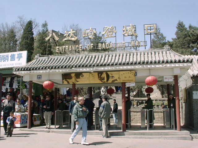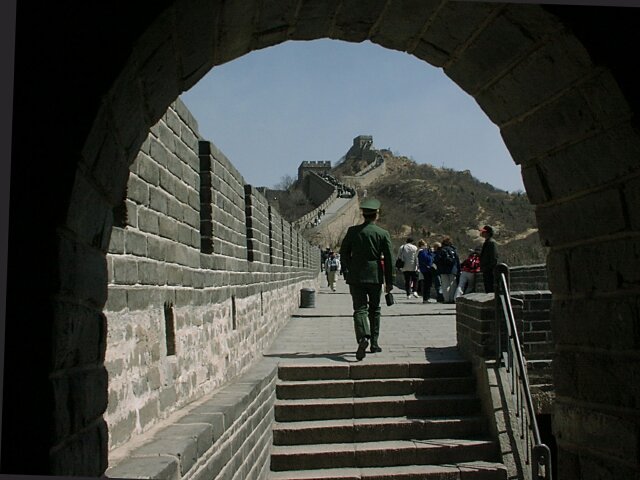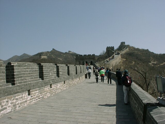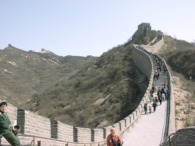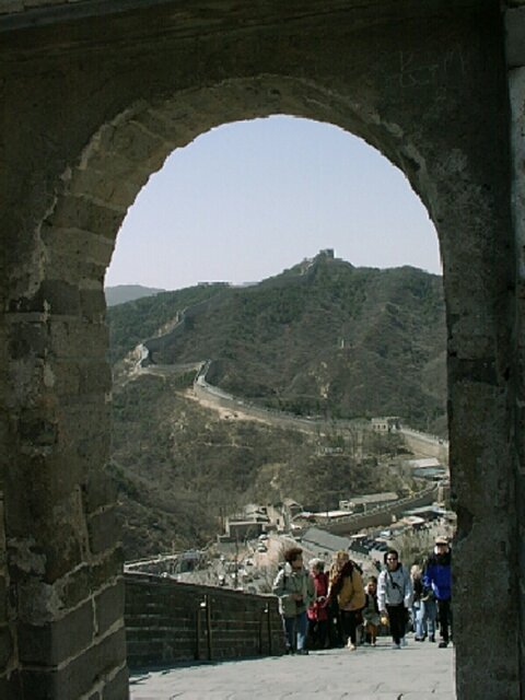 THE GREAT WALL The Badaling entrance is near the low spot of a very steep dip as the Wall crosses a valley. Whichever direction you go, eventually there is a steep climb. The difference is that the "easy" side starts out as a fairly level stretch. It soon gets very steep, however, and if you go far enough, it's actually higher than the "difficult" side. We probably went further than we should have. Jane was still very weak and found the climb very difficult. The cold wind didn't help. Nevertheless, it was a thrill to find ourselves on top of the Great Wall. Construction of the Wall started in the 7th century B.C. After the unification of China in 221 B.C., the various sections were joined to form a single wall more than 3,000 miles long. In 1368 the Ming Dynasty began a major renovation that continued for two centuries. In addition, many new sections were added, bringing the total length of the Wall to more than 3,800 miles. The Badaling section that we saw was one of the 14th century additions (now largely restored). It averages more than 25 feet in height and 19 feet in width at the top. Every so often there are towers with battle ports.