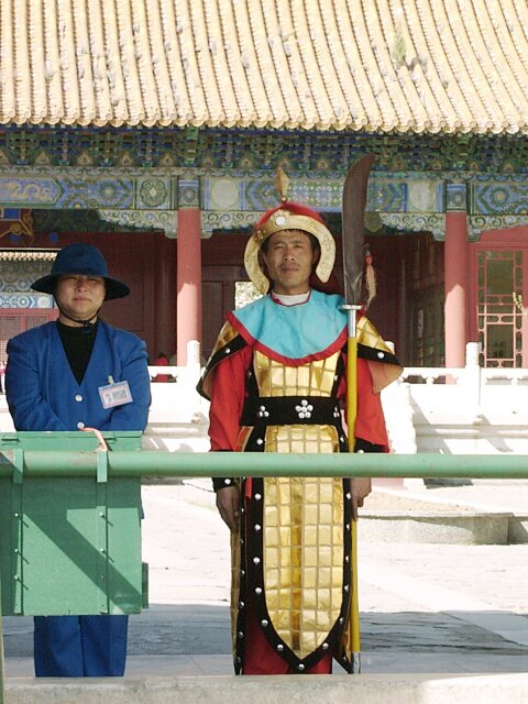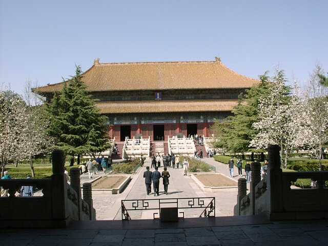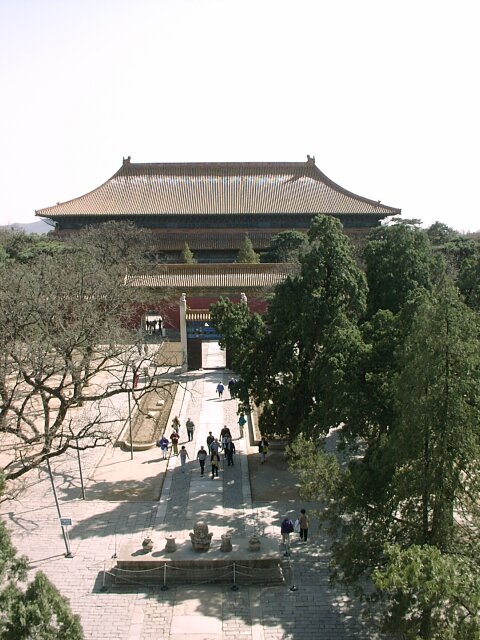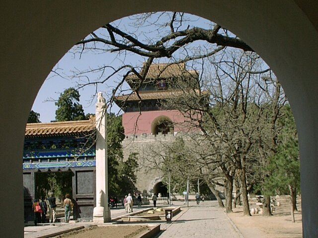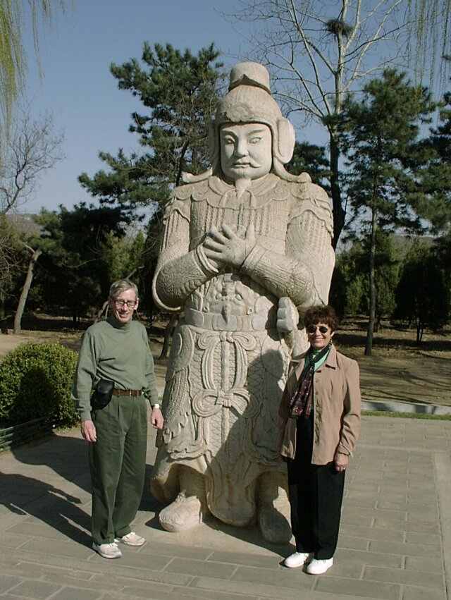 By the time we came down from the Wall, the weather had improved noticeably. The area at the base of the Wall, and extending for the entire two blocks to the bus parking lot, was lined with little stands selling tourist souvenirs. Every vender, on spotting any "big nose" (Caucasian) passing by, would waive some piece of merchandise and shout out an endless, rapid fire string of hellos to get attention. Since several venders could see us at once, and often on both sides of the street, there was a constant cacophony of "hello, hello, hello, hello, . . . ." MING TOMBS We left Badaling around 1:00 p.m., and the bus took us south toward the Ming Tombs. We stopped for lunch along the way. Between 1409 and 1644, thirteen Ming emperors were buried in separate tombs in a 16 square mile area. Each tomb is located at the foot of a separate hill and is linked with the other tombs by a road called the Sacred Way. We visited only the Chang Ling Tomb (built in 1413), where Emperor Yong Le was buried. There were several ornate buildings and beautiful gardens. It was more like a palace than a tomb and, truth be told, more enjoyable than the Forbidden City. Afterwards we walked the length of that section of the Sacred Way open to tourists. It must have been close to a mile long and was lined on both sides with matching pairs of huge statues of various officials and animals, 18 pairs in all. By the time we met the bus at the far end, the day had become sunny and quite warm.