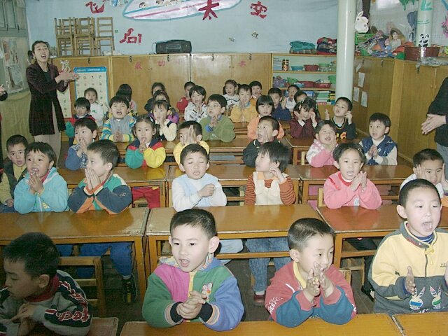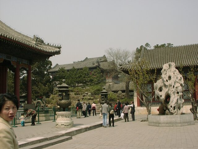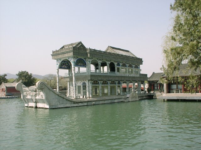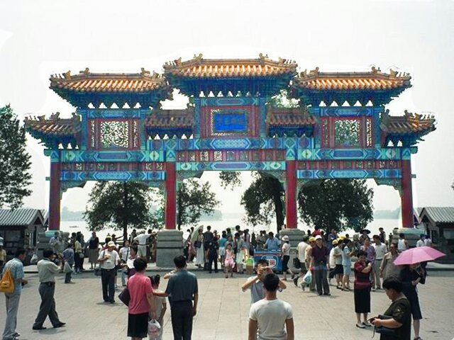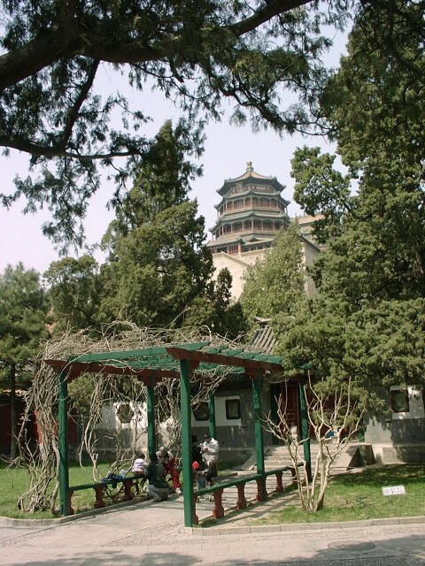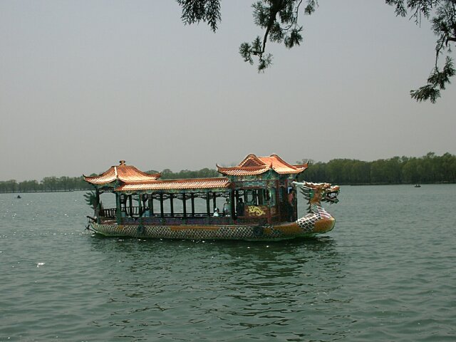 BEIJING First we visited a school, really more like a day care center. It kept the neighborhood children all day so the parents were free to work. The kids were darling and very well behaved. They marched, danced, recited and sang for us. Next we went to a widow's home. She told us (through a translator) about her life and her family. We asked her additional questions that she readily answered. Her home was small but comfortable, and she seemed quite happy with her life. By this time we'd had ample opportunity to observe Beijing chaotic driving patterns. There was one in particular that fascinated me. We've been all over the world and have never seen anything like it. I call it "echelon turning." When one car was waiting to make a left turn, the next car wanting to make the turn would not stay behind the first car so as to follow in its path. Instead it would cut just inside the first car. The third car would do the same to the second car, and so on. When the first car finally started to move across the oncoming lanes, the second car turned inside the first and parallel to it. When there were a dozen or more cars waiting to turn left, this was quite a sight because some of them were starting their left turn in the middle of the block. Then they just drove on the wrong side of the street until they reached their corner. When we left the hutong, the bus took us to the Summer Palace. This was probably the most delightful place we visited in China, and we had lovely weather to help us enjoy it. Although there was an earlier summer palace on this site (burned by British and French forces in 1860), the present complex was built by Empress Dowager Ci Xi in 1885-1895. It is more of a park than a palace. Building it was a tremendous undertaking that involved excavating hundreds of acres to create an artificial lake, then using the excavated material to build a high hill on the north side of the lake. It is said that the Empress used funds that had been set aside to modernize the Imperial Navy and, in a gesture of contempt for her critics, she had a huge marble boat built on the lake. (Probably not by coincidence, in 1895 China was defeated in a war with Japan after a disastrous naval defeat.) Our tour group was given 90 minutes on our own to explore the grounds on the north side of the lake. There were many Chinese families enjoying the beautiful day. We came across one family with a little girl wearing a period dress. She looked like a little princess. We walked the entire north shore of the lake, mostly in an ornately decorated, half-mile long covered walkway. We ended up at the Marble Boat where our tour group reassembled. We had lunch at a lovely restaurant on the grounds before taking one of the "dragon boats" to the south side of the lake. Our bus was waiting there and took us directly to the West Beijing train station. There we caught the 5:10 p.m. overnight train for Xian. All of us were expecting the train trip to be awful. As it turned out, though, it wasn't bad. Each couple had a separate compartment. There was a toilet at each end of the car, as well as a sink room at one end. We each had a box lunch and bottled water for supper. We went to bed (in our clothes) about 9:30 and slept fairly well.