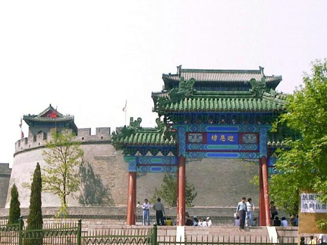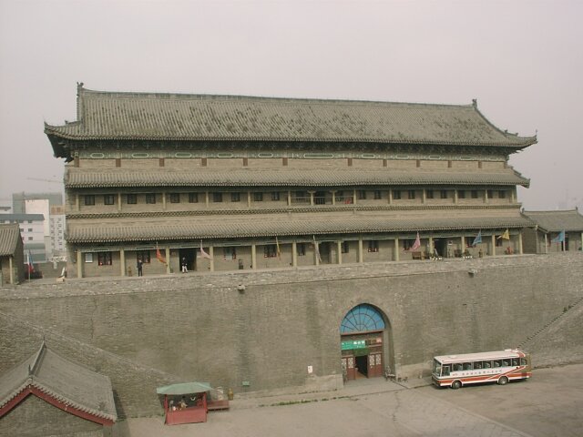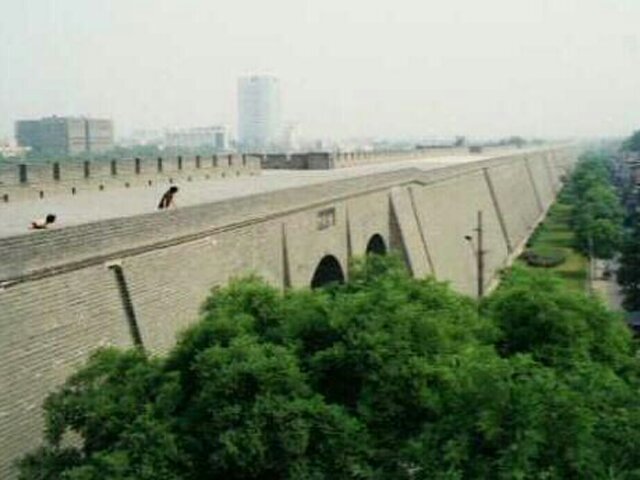XIAN Thursday, 13 April. After the breakfast buffet, the bus took us to the West Gate in Xian's old city wall. The city wall is massive, higher and wider than the Great Wall. Another major difference is that the Xian wall is perfectly level. This made it possible to have a moat outside the wall. Even this moat has been preserved. There are four huge gates in the wall, one facing each direction. Each gate has a drawbridge over the moat. Our bus parked just inside the West Gate, and we climbed the many steps to the top. (Jane, still very weak, waited in the bus to preserve energy.) The wide, flat surface of the wall would be perfect for jogging. There was a great view, too.