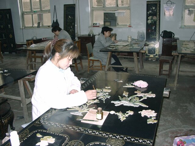 lacquered furniture, tie-dying silk scarves, and weaving silk carpets. We