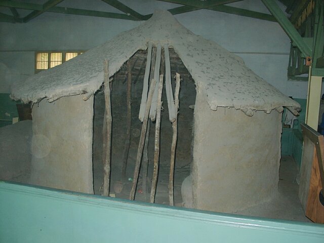 Our next stop was the Banpo Museum. The museum building has been erected over an archeological dig of a Neolithic village dating to 4000 B.C. The village had about 46 buildings and more than 200 inhabitants. It was a matriarchal society based on farming. There were three distinct types of houses (some round, others rectangular), using different construction methods. There was a trench around the entire complex, both for protection and for drainage. There was even a large meeting hall in the center of the village. The villagers made their own stone tools and pottery. A cemetery outside the village contained about 250 bodies, but young children were buried alongside the huts in special clay urns.