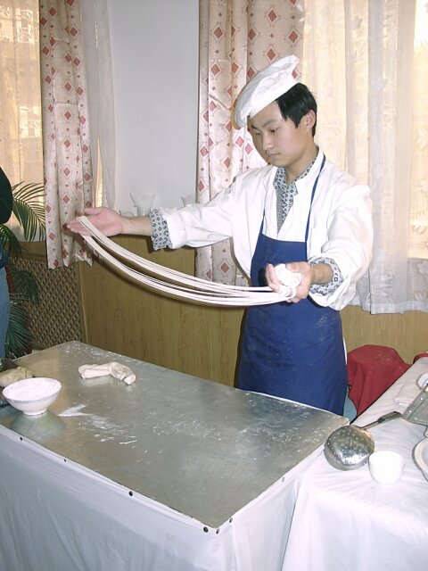 Our schedule called for a visit to a noodle factory next, but we went directly to a restaurant for lunch. At a small table near us, one chef was making noodles by hand. That was the noodle factory! Still, it was fascinating to see him start with a roll of dough and wind up with a handful of noodles, just by pulling and folding.