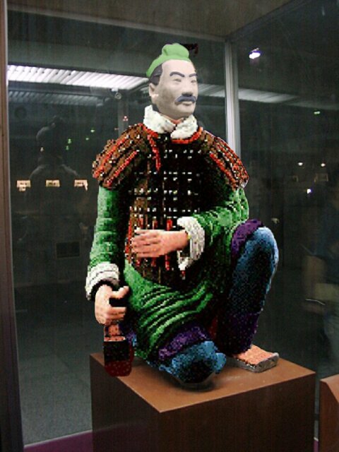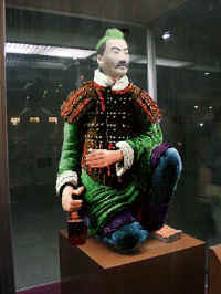 There are three pits at the site. The soldiers in Pits #1 and #2 are in battle formation; those in Pit #3 apparently formed an army headquarters. Only a portion of the site has been excavated, so it's uncertain what may yet be found. Pit #1, the largest, contains mainly infantry. About 1,000 of an estimated 6,000 figures of infantrymen, archers, and charioteers have been unearthed there. The terra cotta soldiers, armed with real weapons, were placed four abreast in columns, each column in a separate trench. Wooden beams were placed over the top of each trench, cloth mats over the beams, then earth was piled on top of the mats. Once the soil was compacted and covered by crops or buildings, the army beneath was completely hidden, and remained so for the next 2,200 years. Although we saw the archeologists still digging out soldiers in Pit #1, the main effort has now been shifted to Pit #2. It has approximately 1,400 soldiers (archers, charioteers and cavalrymen) plus 400 horses and 80 chariots. Pit #3 contains 68 figures of officers. The head of each of the many soldiers is unlike any of the others. They were painted in life-like colors, though all but traces of the paint has disappeared in the ensuing 2,000 years. Here is an example of what an archer would have looked like with the original paint. We had a couple of hours to rest back at the hotel before leaving at 6:30 for a Mongolian "hot pot" dinner. (Jane was so exhausted that she stayed in our room. I brought her back some fried rice and rolls.) Each person at the table had a metal bowl of boiling water heated by Sterno. We'd each put a small amount of raw food at a time into the water and let it cook before eating it. Most of the group didn't care for it very much. (I wasn't too thrilled about eating pork cooked this way.) After dinner we returned to the hotel and packed for our departure the next morning.