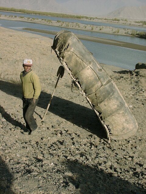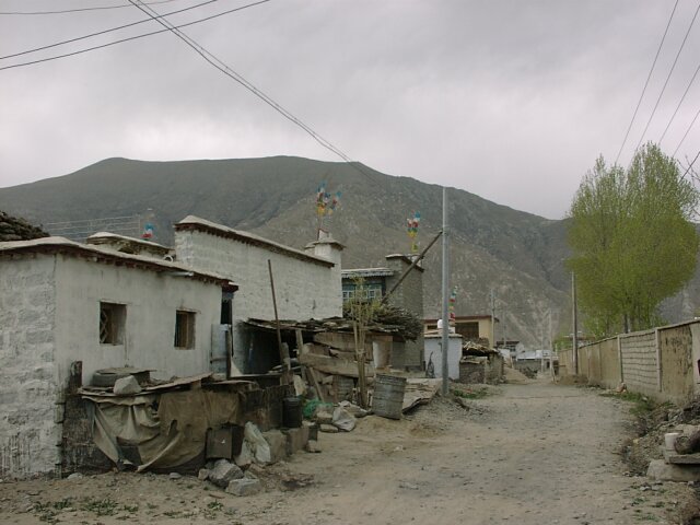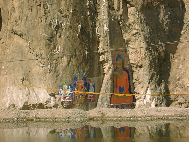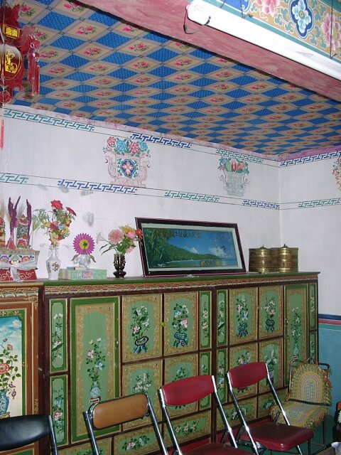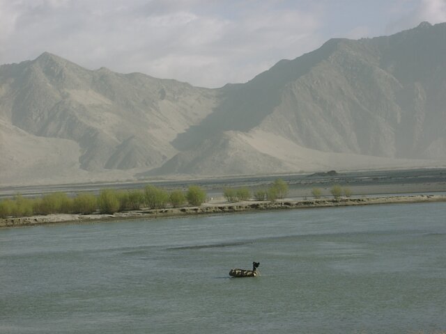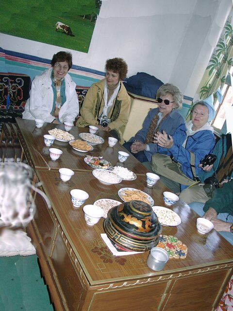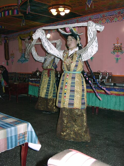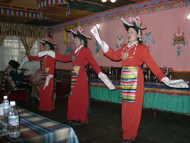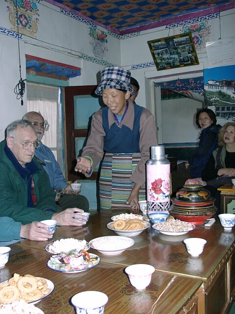 TIBET Sunday, 16 April. We were up at 4:15 and down at the breakfast buffet at 4:50, as instructed. The problem was that the hotel was just beginning to set up the buffet, and there was very little out yet. The bus left for the airport at 5:30. We took a 6:45 flight to Lhasa. Again, it was a very pleasant flight (even though it was completely full) and right on time. We landed in Tibet at 8:40 and were met by Tashi, our local guide who, pursuant to Tibetan custom, presented each of us with a long white scarf (hada) as a token of esteem and good luck. That's also when we learned that the airport for Lhasa isn't even in the same province as the city. Even though Lhasa is only 20 some miles away, it's a 60-mile drive (two hours) to get there because there is no bridge over the Yangtze River on a direct route. We had to drive 20 miles upriver, then 20 miles back down on the other side. We began to appreciate that traveling in Tibet was going to be very different. After several miles, the bus stopped along the road where a man was waiting for us with his yak skin boat pulled up on shore. There were a couple of other boats out on the river with the high mountains as a backdrop. It certainly was beautiful. Our brochure had promised us the opportunity to ride in the boat, but it was not to be. They had discontinued the practice after some German tourists capsized the boat and drowned. So we only got to examine the boat on shore. Later, on the other side of the river, we stopped again to see a Buddhist shrine consisting of figures painted on the rock. According to Tashi, the shrine dated from the 7th century, but the painting was clearly very recent. We saw several farms along the way, some with yak or horse drawn plows, but never any machinery. Tashi told us that the river was important to the custom of "water burial," still practiced by most Tibetan families who live near the river. When a person dies, the body is cut into pieces by a specially trained expert, and the pieces are thrown into the river. If the expert is not available, or the family can't afford to hire him, the whole body is thrown into the river. Just think about it! All of China is downstream from Tibet. [This is similar to "sky burial" in which the cut-up pieces of the body are laid out to be devoured by vultures.] We got to the Tibet Hotel in Lhasa at 10:45. We were immediately served yak butter tea in our room. (We didn't care for it.) The hotel was modern looking but lacked many modern amenities. For example, we found there was no central heat. However, they brought us a very efficient electric heater that kept the room quite comfortable. The electricity occasionally went off, and there often was no hot water. Most noticeable though, the halls, lobby and other common area were unheated and freezing cold, usually colder than the air outside. Worst of all, the food at the hotel was terrible, and we ate almost all our meals there. The Tibetans are not the same race as the Chinese. Their origins are entirely different, and their skin is much darker (perhaps from the sun). Lhasa seemed very poor and run down compared to the Chinese cities we had visited. Of course, it is much smaller with a population of 150,000 versus several million in those other cities. The main streets are wide and well maintained, but most of the side roads are unpaved and very rough. We saw cattle being herded down the main streets. There are no tall buildings. There are a cement factory and a brewery, but very little other industry. The surrounding farms produce only a small amount of wheat and barley. Consequently, almost everything else has to be brought in from Chengdu, either by plane or by truck. The trip by road takes three days each way. (A railroad from Chengdu to Lhasa was completed in 2006, cutting the travel time to eight hours.) Our group met at 5:00 p.m. and the bus took us for our visit to a Tibetan home. The dirt road outside and the exterior wall of the house were not very attractive. We could see a yak skull over the entrance and five small flags flying above a corner of the house (blue=sky; white=clouds; green=water; yellow=earth; red=fire), in keeping with the almost universal Tibetan tradition. As we passed through the front gate, we found ourselves in a large courtyard. The house, seen from here, was quite pretty. Inside we found a brightly decorated room with a long, low table set with snacks. After we sat down, our hostess poured the traditional butter tea. With Tashi acting as interpreter, we asked her questions about her house and life in Tibet. Her house, with several rooms, was larger than average. It had electricity but no running water. There was a hand pump in the courtyard. There was a wood stove for cooking, but the house had no heat (not even in winter). Surprisingly, the winter temperature on the Tibetan Plateau (as opposed to the mountains) seldom gets below the mid-20's. Most Tibetans bathe only once a year, a ceremonial bath in the river. Yet we never noticed a trace of body odor, even later when pressed tightly against Tibetans in their shrines. After a brief stop at our hotel, the bus took us to the Mad Yak Restaurant. Our buffet dinner included yak stew. After the meal there was a floorshow, referred to in our schedule as "Tibetan Opera." It consisted of dancers in ceremonial Tibetan costumes and masks. We were back at the hotel by 8:00 p.m. It was still very light outside. All of China has the same time zone. Because Tibet is so far west, its "sun time" is about two hours behind the official time. It had been a long day, and we were glad to get to bed early.