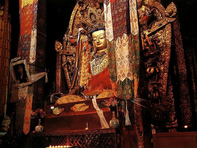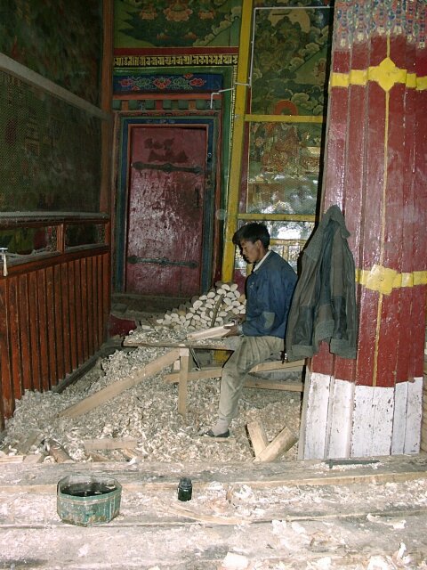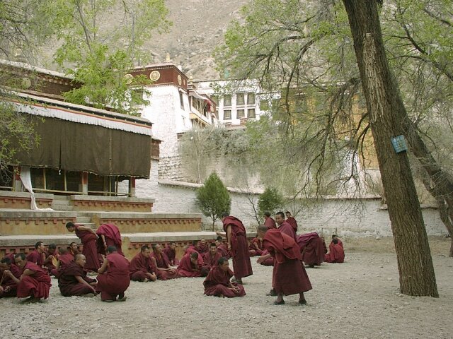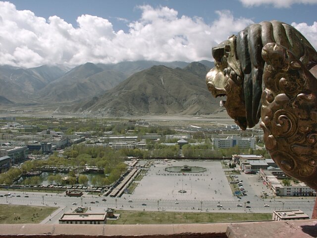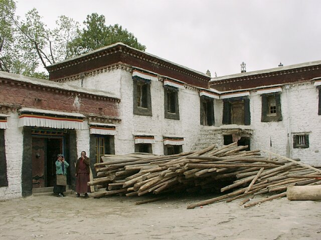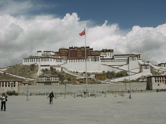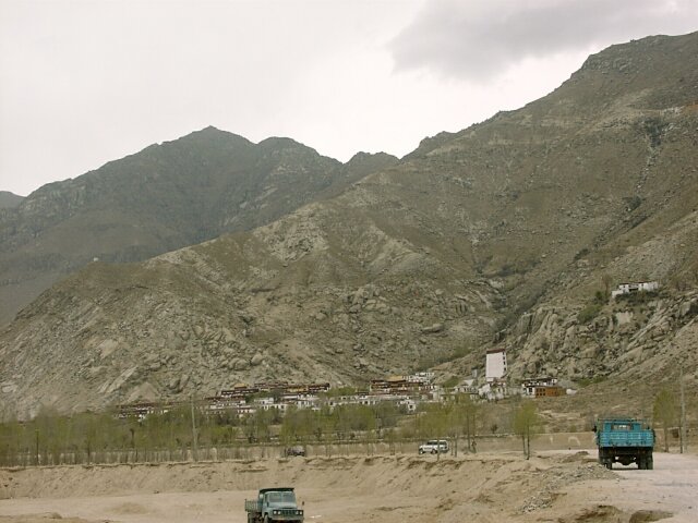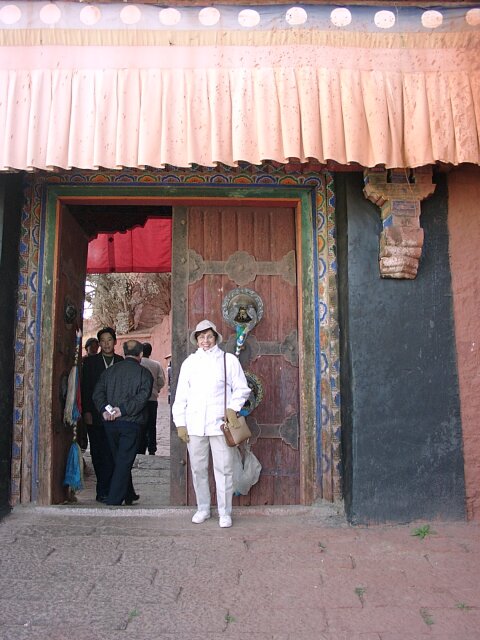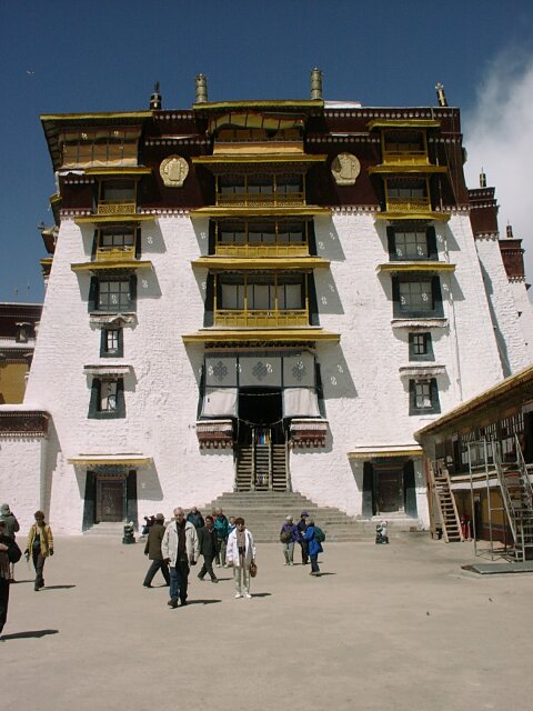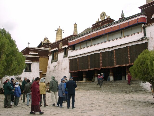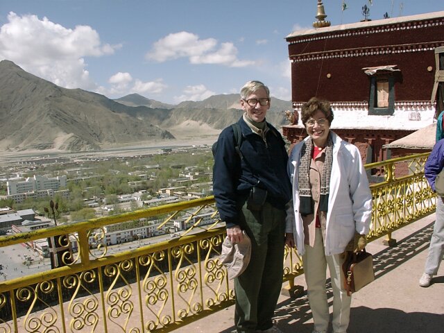 TIBET Monday, 17 April. The breakfast buffet, like most of the meals at the hotel, was very poor. At 9:30 we drove the short distance to the Potala Palace. The Palace is an imposing site, standing high on Red Hill in the center of Lhasa (which otherwise is as flat as a pancake). Its origins can be traced to about 641 A.D. when the king who first unified Tibet built a palace on this hill. Most of it was destroyed over the ensuing centuries. The present palace was constructed (1645-1694), but incorporated some remains of the original palace. The Palace has two main sections. The Red Palace is nestled on top of the White Palace. The Red Palace (the religious part) contains the living quarters and tombs of most of the Dalai Lamas, as well as many temples housing thousands of gilded statues. The White Palace (the secular part), when Tibet was independent, housed the administrative offices of the Tibetan government. The Red Palace also contains two small chapels from the original 7th century Palace. As we were soon to discover, the Potala Palace draws thousands of Tibetan pilgrims every day. Our bus took us up a narrow drive on the left side of the Palace. We then walked further up and entered through a rear door on one of the highest floors. This meant that almost all our climbing would be down, an important advantage since the roof of the 13-story Palace is nearly 1,000 feet above the street in front of it. It also meant that we would be going in the opposite direction from the pilgrims who entered through the front door. Almost every pilgrim carried a "butter lamp" (or a cheaper substitute). Originally, this lamp was a small, brass, chalice-like cup filled with yak butter and having a wick in the center. Each shrine has hundreds of wicks burning in butter (like votive candles). The pilgrim would tilt his lit butter lamp so that a drop of his butter fell onto every wick in the shrine, in effect making every candle his own votive candle. Nowadays, the butter has largely been replaced by margarine, and many pilgrims do not purchase the brass lamps. We saw many who just carried an open kilo (2.2 lbs.) package of margarine and a spoon to hold over the flame. As you can imagine, the smell of all that margarine burning in crowded, confined spaces was sometimes overpowering. We climbed up to the roof of the Red Palace where there was a great view. The "stairs" were like uneven ladders, very difficult to negotiate. We worked our way down and forward through dozens of chapels and shrines, including the two from the 7th century. Tashi insisted on lecturing us on Buddhist theology and identifying each of the hundreds of statues by name. He had studied in India, and we suspect it was in a Buddhist monastery. His knowledge was impressive, but his lectures became very repetitive since statues of the same Buddhas recurred again and again. We finally came out the front entrance into a beautiful warm and sunny day. There were scores of vendors in little booths, but only a fraction of what we'd seen at the Great Wall. Our bus took us to the large square across the street where there was an unobstructed view of the front of the Palace. By 1:00 we were back at the hotel for lunch. At 2:30 we set out for the Sera Monastery (founded 1419). It was nestled at the foot of Tatipu Mountain outside of Lhasa at the end of an unbelievably bumpy dirt road. In Tibet the monasteries have long been the only available means of education for most young men. Before the Chinese takeover, there were about seven thousand monks in the three colleges that make up Sera. In March 1959, Chinese tanks bombarded the monastery. Many monks were killed. Many others fled to India where, eventually, a new Sera Monastery was established. Tashi, though a Tibetan, never mentioned anything about the Chinese invasion or the partial destruction of the Monastery. In fact, he got visibly nervous when any of us asked a question relating to Chinese-Tibetan relations. He did give us many more lectures on Buddhist theology. (They sounded like the same ones he'd given at the Palace). He showed us many elaborate shrines, collections of scriptures, and works of art. There were pilgrims everywhere because the Sera is one of Tibet's holy places. An interesting change, though, was our visit to the monastery's large courtyard crowded with monks engaged in animated debates. We got back to the hotel at 4:30. Jane was having nausea, either from the 12,000-foot altitude or from the altitude sickness medicine (diamox). We ate in the hotel at 6:30. The food was really bad. Often the only meat was at least 95% bone or gristle. We wondered what they did with the rest.