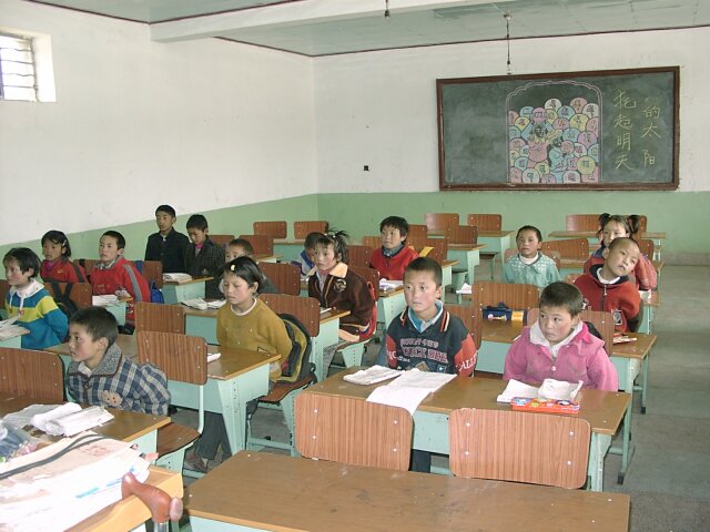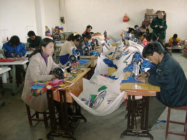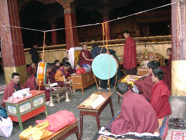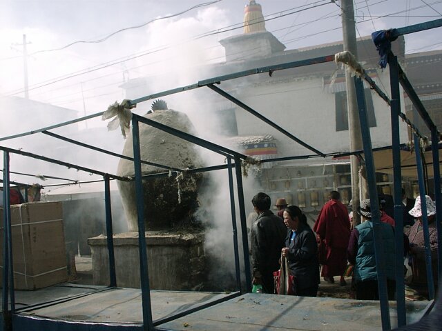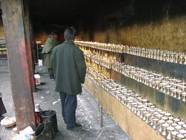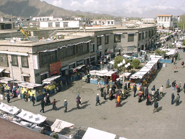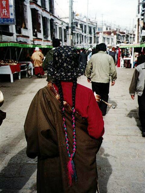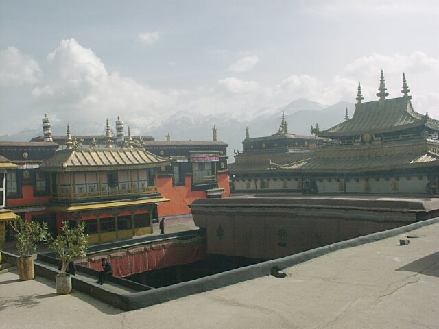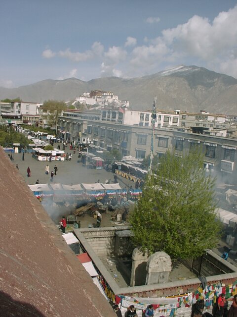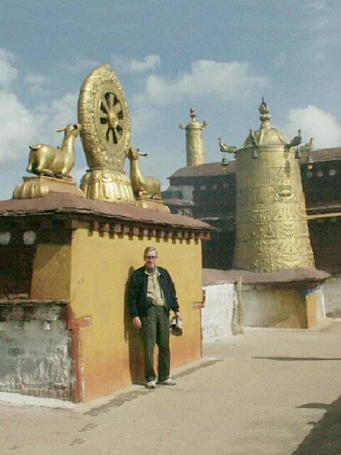 TIBET Tuesday, 18 April. The breakfast was a little better than it had been our first morning in Tibet. At 9:30 the bus took us to the old Barkhor district where we visited the Jokhang Temple, built in the 7th century by the same king who built the original Potala Palace. Like the Palace, much of it was rebuilt in the 17th century. This is the most holy temple in Tibet and is a site of pilgrimage for Tibetans from the entire country. Tashi led our group through the Temple, often struggling to get through the crush of pilgrims. Other than pointing out the original Statue of Buddha that the Temple had been built to house, he gave us what seemed like the same lecture in Buddhist theology we'd already heard so often. We went onto the roof where there was a nice view of the market, as well as of the Potala Palace. When we finished inside the Temple, we had over an hour of free time. We did the "circumambulation" on the circular path around the Temple (called the kora). It is also considered sacred, and we passed many pilgrims walking it, prostrating themselves every few steps or lining up at the five gigantic incense kilns spaced along the way. Like most places that attract visitors, the area was very comercialized. The kora was completely lined with vendors' stalls, and the big Barkhor Market filled the square in front of the Temple. We looked but didn't buy. At noon the bus took us back to the hotel for lunch. (We'd rather have gone elsewhere.) Then at 3:00 p.m. we went to visit a school down another bumpy dirt road at the edge of Lhasa. It was described to us as a school for the handicapped, but for many of the students the handicap was not physical, but that they were orphans or children from very poor families. We learned that, unlike China proper, there is no free public education in Tibet. Only those who can pay are educated. The majority of the population is poor and therefore never goes to school at all. Naturally, the literacy rate is very low. The school we visited is an exception since it does educate poor children. It currently had 108 students, but it operates on a shoestring. Many of the children learn crafts and make things that are sold to visiting tourists. (We bought a decorative cloth hanging.) Some of the tourists also send donations of money or used clothing. The children live at the school. They sleep eight to a room with little or no storage space for their clothing or personal effects, apparently not a problem because they don't have any. It was really heart-wrenching, especially considering that these children are the few most fortunate ones. We got back to the hotel at 4:30 and attended a one-hour lecture on Tibet at 5:30. That was followed by a Western-style dinner, our best meal at the hotel. It consisted of mushroom soup, a yak burger with french fries, and dessert. The yak burger was a big hit with everyone. It tasted just like a hamburger, though a little less juicy.