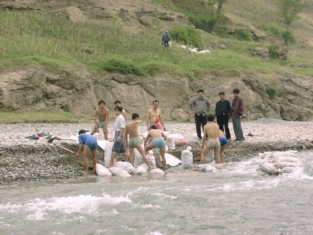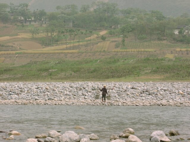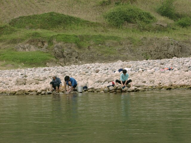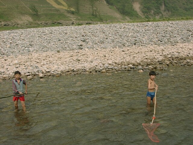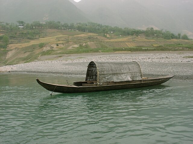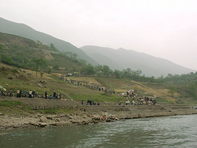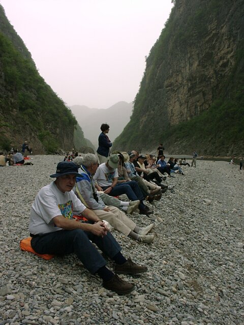 At 7:00 a.m. we had breakfast and at 9:00 we disembarked at Wushan, where the Danning River joins the Yangtze. A bus took our group a short distance to a pier on the Danning where dozens of motorized sampans were waiting. After boarding, we headed upstream to see the Lesser Three Gorges. This excursion proved to be the most enjoyable part of our Yangtze cruise, and probably of the entire trip. The water level was low, and the river was full of rocks. To keep us off the rocks, there were two polers on the bow. They really had to work hard as we passed through many shallow twists and turns in the river. Besides the tourist sampans, there was a regular "bus" service on the river for local residents. At a couple of points where the water was very shallow, there were landing areas where these "buses" would discharge all their passengers who then had to climb long flights of stone steps and walk a path parallel to the river. Eventually, once they were past the very shallow parts, the "buses" would pick up their passengers again. We were glad we didn't have to go through that.