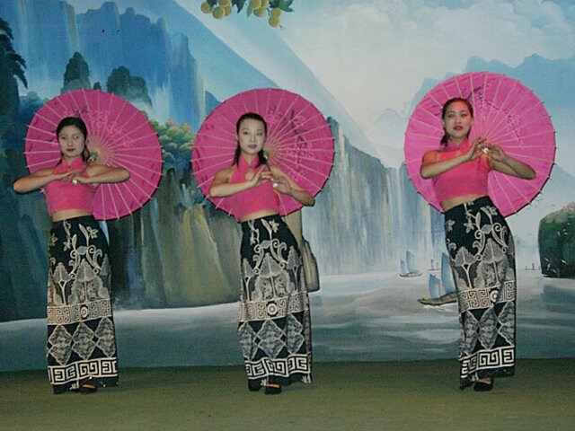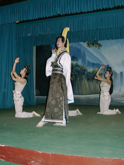 We passed through Dragon Gate Gorge, Misty Gorge, and Emerald Gorge in succession. In each of these gorges there were steep cliffs, not as high as those in the Yangtze's Three Gorges, but probably more impressive because we were in such a small boat. (The sampan could hold about 30 people, but only our group of 18 was on ours.) In between the gorges, the land flattened out some, and we saw farms, shepherds, and women washing clothes. At one point, first two young boys, then an old man, waded into the water and reached out to our boat with long bamboo poles with a net on the end, begging for contributions. It took us more than three hours to reach the far side of the Lesser Three Gorges. There our sampan tied up, and we ate our box lunches sitting on a large sand bar. We noticed that the boat crew (including the polers) had no lunches. Those in our group had so much more food than we needed that everyone started giving food to the crew. After they had eaten some of it, they would stash the surplus away, either to eat later or take home to their families. For the return trip downstream, a large rudder was attached to the bow of the sampan to guide it through the rocks. It only took one hour to get back to our starting point in Wushan. The shuttle bus got us back to the Victoria Pearl at 2:30, and she left Wushan at 3:45. Soon after, we entered the Wu Gorge (27 miles long) where the Yangtze passes beneath 12 different mountain peaks in the space of just a few miles. This is the only one of the Three Gorges that we entered in full daylight. The weather was so overcast, though, that it didn't make much difference. For the most part, there are no towns or villages along the Yangtze in the gorges themselves because the sides are too steep. Even outside the gorges, the region the upper Yangtze flows through is very mountainous. Nevertheless, the hillsides are farmed and there are many villages and some larger towns overlooking the river. Most of these (a total of 153 towns and 4,500 villages) will be submerged when the new dam is completed and the 370-mile-long lake fills behind it. (The water will rise 440 feet by 2003, and 570 feet by 2009.) In many cases new villages or towns higher up the hillsides have already been built and occupied. The older ones lie abandoned. We were told that, although some older people regret the loss of their ancestral homes, most of the younger ones are delighted to be given modern new homes. On the subject of construction, almost all the buildings we saw in China were masonry of some kind. In the cities, an orangish brick seemed to be the most common. In rural areas, there was some brick, but a gray stone was most prevalent. These stones were cut into rectangular blocks of various sizes by hand! At 6:30 p.m., just as dinner was served, we docked at Zigui at west end of the Xiling Gorge. In addition to our regular lazy-susan fare, the buffet table featured spaghetti and meat balls. Our group (like most of the passengers) ate it ravenously. It would have been considered very poor by Italian standards, but we were desperate for Western food. At 8:00 p.m. we went ashore for a folk performance in a theater on the dock. (They didn't call this one an opera.) We were back on board around 9:00.