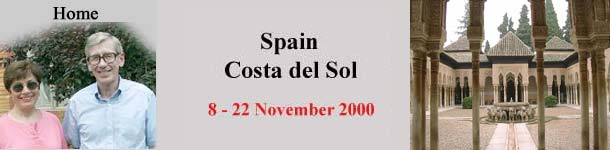 Introduction. We had finally signed up for Grand Circle Travel's "All Inclusive Costa del Sol" trip after having watched it for years. We had been waiting to do it with my siblings, but we were never able to get them all on board. So finally we went ahead and booked it on our own. Then Jane's brother, Tom, and his wife, Kyoko, unexpectedly asked to join us, their first venture to Europe. The trip seemed to be a great bargain, offering two weeks in a first class hotel with all meals and beverages included, and even an open bar every evening. The price was almost unbelievably low. Wednesday, 8 November. Jane and I drove to Culpeper and picked up our daughter-in-law, Julia. She rode with us to Dulles Airport and then drove our car back to their house. We got to the airport about 1:30 p.m. Our flight to New York on United Express was scheduled to depart at 3:23. During the wait we met five other travelers who were going on the same flight to New York and then the same 7:30 p.m. charter flight to Malaga as we were. They were a congenial bunch, all on Grand Circle Travel tours to Torremolinos, but only one couple was in our particular tour group. As it turned out, we were very happy to have their company. The United flight was delayed over two hours, and we missed our connection in New York. We had to wait for the next evening's flight to Torremolinos on Air Plus Comet (a Spanish charter). The seven of us stayed at a Ramada Hotel near JFK. We had dinner together that night and had a great time. Thursday, 9 November. We had breakfast at the hotel with the others, then we all went back to the airport and wandered around. After lunch in the terminal, we checked in for our flight. This one left at 6:30 p.m., and it was less than a third full. We were able to take three seats each and get a little rest on the seven hour flight. |