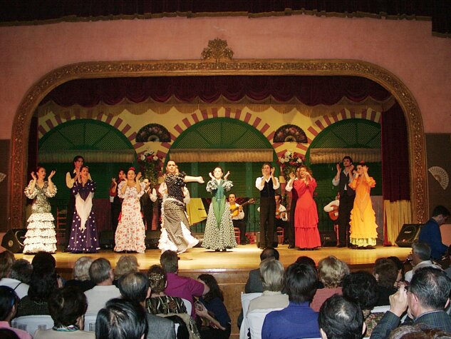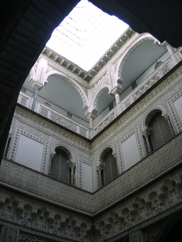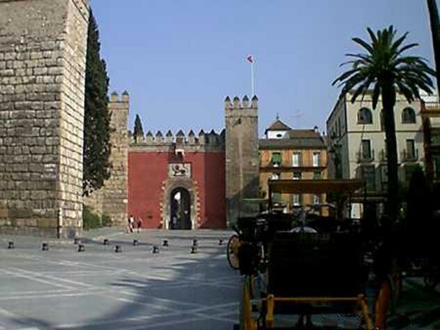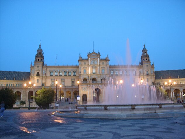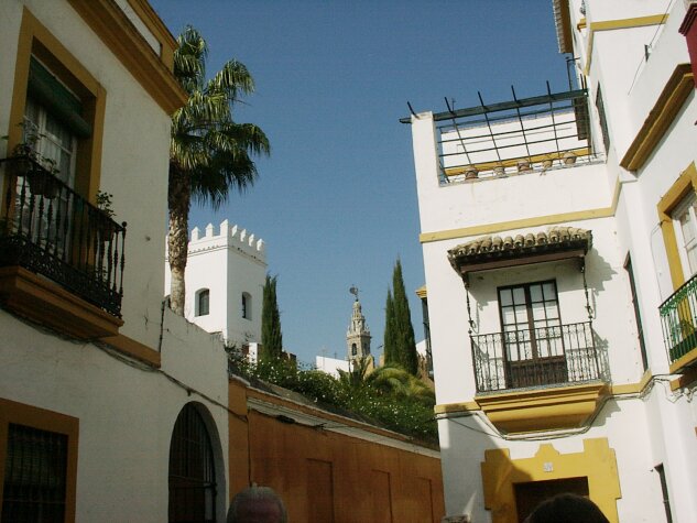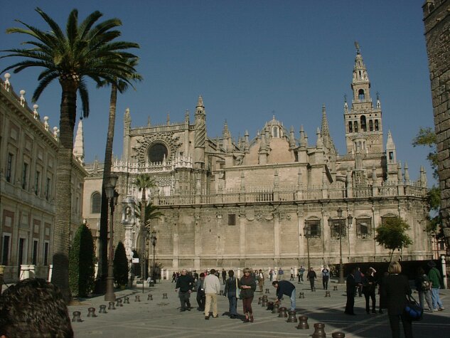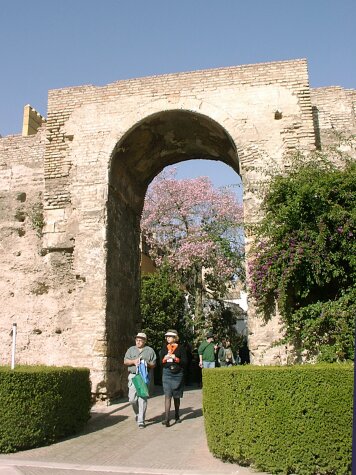 Sunday, 12 November. The bus picked us up near the Tropicana at eight, then went to the Nautilus for the others. By 8:30 we were on our way to Seville. (Jane and I had been there on a tour in 1972.) The weather was sunny and warm. We stopped at the village of Aguadulce on the way. This village is the source of most of the special Christmas cookies sold in Spain. We bought a box of cookies and a box of chocolate truffles. (When we finally ate the cookies after the trip, we discovered that they are very unusual, apparently because they are made using finely ground almonds instead of flour.) We got to Seville about 11:30 and were dropped off near the Cathedral, built beginning in 1401 around a 12th Century mosque. The huge old minaret, known as the Giralda, is now the bell tower. The tomb of Christopher Columbus is in the Cathedral, but we never went inside. (Fortunately, the two of us had seen it on our 1972 visit.) With a local guide, we toured the magnificent rooms of the nearby Royal Alcazar, begun in 913 A.D. (An "alcazar" is a fortified palace.) This is where Ferdinand and Isabella received Columbus. From the Alcazar we walked through the Juderia (Jewish Quarter), then back to the bus. We passed the Golden Tower (1222 A.D.) on the drive to the restaurant where we had lunch. Afterward the bus took us to the Hotel Macarena where we were to stay that night. It was only about 2:00 p.m., bright and sunny. We thought it odd that we were left to sit in the hotel for more than three hours in the nicest part of the day. Jane and I took a walk around the area near the hotel and tried to visit a historic chapel nearby, but it was closed. Finally we returned to the hotel and rested. Around 5:30 our group left for the bus tour of Seville. We rode down some of the most elegant boulevards, past marvelous houses and other impressive buildings. Seville has been host to two Expositions (or World Fairs), one in 1929, the other in 1992 (the 500th Anniversary of Columbus' voyage). The second site was built around the first, and our tour focused on the older area. We finally came to the Plaza de Espana, heart of the 1929 Exposition. It was a beautiful place, even at dusk. Actually, it may have been more beautiful then because all the lights were on. By seven we were at the theater-restaurant where we had dinner, then saw what was billed as a flamenco show. There was plenty of flamenco, but the performers mixed in many other styles of dancing as well. It was an excellent show. Afterwards the bus took us back to the hotel. |