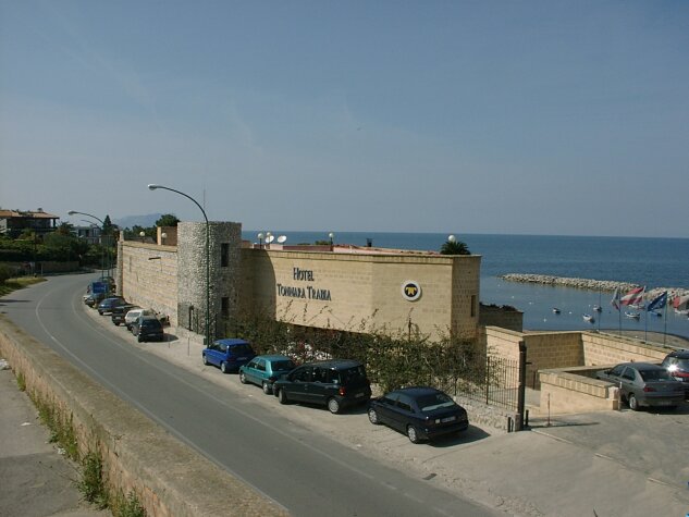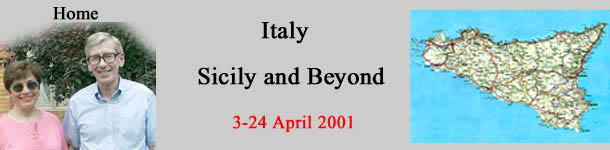 Page 1 2 3 4 5 6 7 8 9 10 11 12 13 14 15 16 17 Introduction. We signed up for Grand Circle Travel (GCT)'s 15-day "All-Inclusive Sicily" and, taking advantage of an option allowing extensions in one-week increments, added an extra week to visit Rome and to see friends in Verona. Despite having lived in Italy nearly four years (1959-1963) and having been back there at least a dozen times since, we had never been to Sicily. So we were looking forward to the trip with great anticipation. We were not disappointed. Tuesday, 3 April. We left home at 8:30 a.m., stopped briefly in Culpeper, and from there our son Joseph drove us to Dulles Airport outside Washington, D.C. We got there about 11:00, and an hour later were aboard our Continental Express flight to Newark, arriving at 1:15 p.m. We had lunch in the terminal, then read and brushed up on our Italian until our 4:35 Alitalia flight. We were in the air at 5:00, and dinner was served before 6:00. The meal included a very bad pasta, proving that the overall poor quality of airline food trumps national pride. We tried to get some rest afterwards with the usual little success. Wednesday, 4 April. The plane touched down in Rome at 6:30 a.m. after a seven and a half hour flight. For reasons known only to themselves, GCT had booked us on a 1:00 p.m. flight to Palermo. We managed to be switched to a 10:35 flight and arrived in Palermo at 11:30. The Tour Director, Oliviero Olivieri, was there to meet us. After a one-hour bus ride through Palermo and east along the coast on the modern autostada, we reached the Hotel Tonnara in Trabia at about 1:30. The hotel is right on the sea, built on the site of an old tuna processing plant. Many charming aspects of the old factory have been preserved and incorporated. After checking in to the hotel, we immediately gathered for a light buffet lunch in La Lampara, the pleasant hotel bar. By the time we returned to our rooms, the luggage had been delivered and we unpacked for our six-day stay. Later, Darrell went out to explore the hotel and grounds while Jane rested. We were scheduled to have dinner in the Rais Restaurant at 7:30, but we went down to the bar a few minutes early to take advantage of the free open bar included in the tour. It turned out that only a few types of drinks were free. The dinner was excellent and our fellow travelers were interesting and friendly. We were still very tired from the trip and the time change and finally went to bed at 10:30. Page 1 2 3 4 5 6 7 8 9 10 11 12 13 14 15 16 17