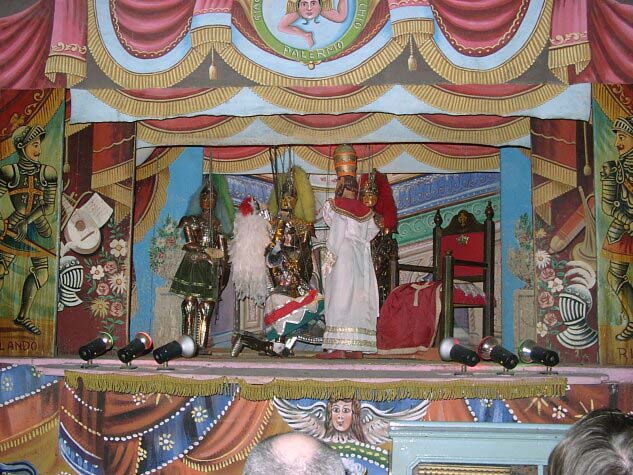 Leaving the Norman Palace after 5:30, we boarded our bus again. Enzo, the driver, battled patiently through the almost unbelievably heavy traffic. Apparently the historical value of the city center is so great that no streets can be built or widened. Eventually we reached our destination, a small theater where we were to see a puppet show. We were told that such shows were the first form of drama after the Greeks and Romans. Because most people were illiterate, the puppet shows were the primary means of teaching them about history, heavily interspersed with legend. not to mention a great deal of propaganda. The plays presented are all "classics" to such an extent that Sicilians of all ages know them, and the characters in them, by heart. The play we saw was enjoyable, perhaps made more so by the unrestrained cheering and jeering of the children in the audience. We had dinner in a trattoria at 7:15 and the bus was on its way by 8:00. If anything, the traffic was even worse. Nevertheless, we were back at the hotel in Trabia by 9:00 and in bed by 10:00. Page 1 2 3 4 5 6 7 8 9 10 11 12 13 14 15 16 17