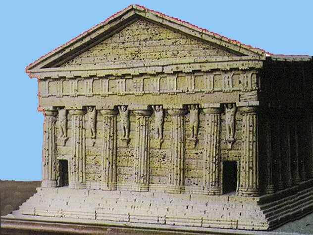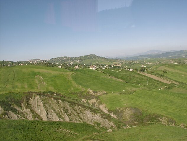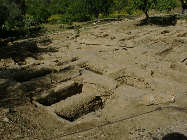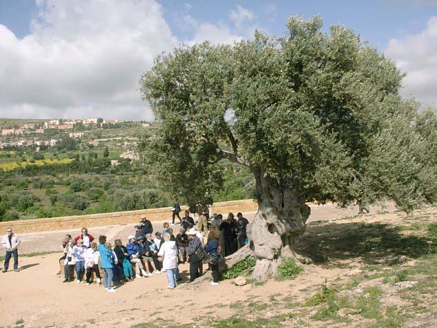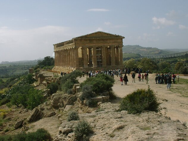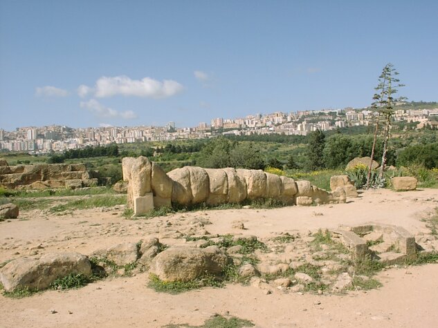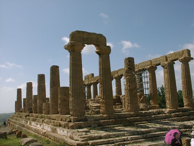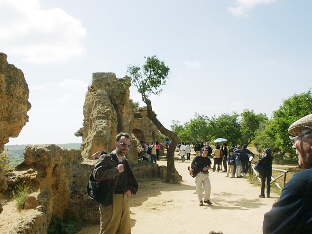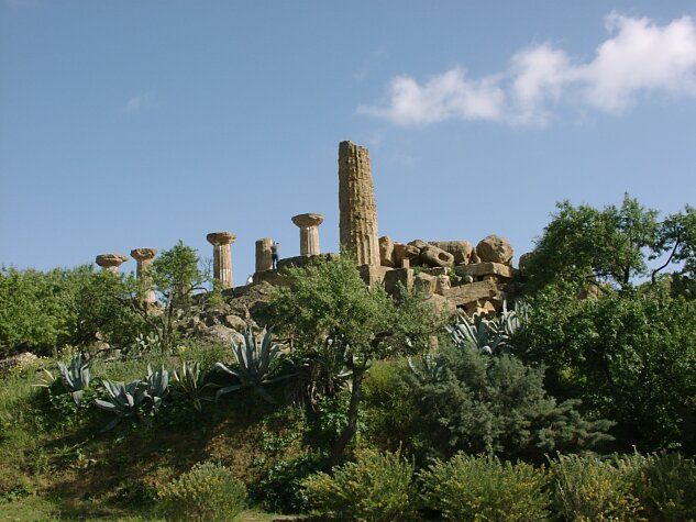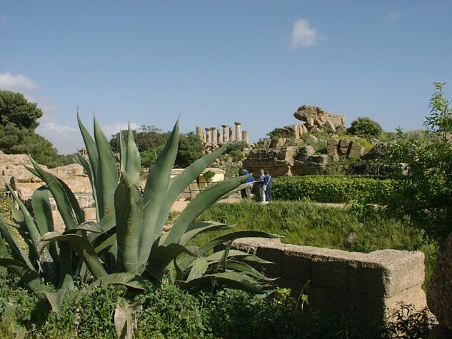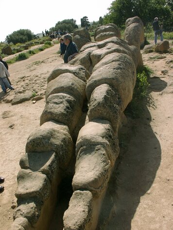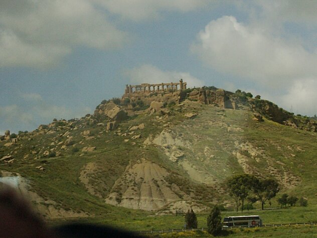 Page 1 2 3 4 5 6 7 8 9 10 11 12 13 14 15 16 17 Tuesday, April 10. We put our luggage out at 8:00, had breakfast, and were on the bus at 9:00. It was a pleasant, sunny day for our drive to Agrigento on the southern coast. Enzo stuck to main roads (the autostada almost to Enna, then the highway to Agrigento), so we made good time. The countryside was surprisingly green, but Oliviero explained that it would turn brown soon enough once the hot, dry summer weather arrived. The prickly pear cactus grew profusely throughout the countryside. We saw many wheat fields on the hillsides, and there were great quantities of a red clover we had never encountered before.The bus reached the Grand Hotel dei Templi in Agrigento after 11:30 a.m. After checking in, we had about an hour free before lunch, so we walked along the main road looking in some of the shops. They weren't very interesting, though. We had lunch at our hotel at 1:00. The dessert, according to Oliviero, at least, was "the best ice cream in the world." Afterwards the bus took us the short distance (about two miles) to the famous Valley of the Temples. Despite the name, most of the temples are actually on top of a steep hill, some of them silhouetted against the sky. Agrigento was founded by the Greeks in the 6th century B.C. It was destroyed and rebuilt several times over the next two centuries. The Valley of the Temples dates mostly from the 5th century B.C., roughly the same time that the Parthenon was built (438 B.C.). From ancient records, it is known that there were 21 temples on the site, but only ten have so far been found. That is more temples at a single site than anywhere else. Unfortunately, most of them are in ruins, with pieces strewn about or missing. Besides the ruins of the temples, there are remains of the city wall, a necropolis, houses and streets. Our first stop was at the Temple of Hera (Juno) (c. 450 B.C.), which has 25 of its original 34 columns in place. Its style has been compared to that of the temples at Paestum. As we moved on, we stopped by a section of the city wall. It had been carved out of a natural stone formation. Next we came to the Temple of Concord (c. 440 B.C.). With all 34 of its columns and even part of the cell intact, it's in the best condition of any of the temples in the Valley by far. That is because it was converted into a Christian basilica around the 7th century. Nearby there's a huge olive tree believed to be almost as old as the temple. Our guide explained that this temple, and the others here, weren't built of marble like those on the Acropolis. Rather they were sandstone, covered with a stucco made with marble dust so they appeared to be solid marble. As we moved on, we passed a large Christian necropolis (cemetery), dating from Byzantine days. Just past that we came upon the largest Sicilian cart we had seen. A little further on we passed the Temple of Heracles (Hercules), the oldest temple in the Valley (6th century B.C.). Only eight of the columns were standing. Finally we came to what had been the Temple of Olympic Zeus (Jupiter), once the third-largest Greek temple in the world [the only larger ones being in Epheses (Turkey) and Selinunte (Sicily), not in Greece]. It's foundation measures 370 feet by 185 feet. It was unusual in that it wasn't surrounded by columns, but had solid outer walls, with half columns (60 feet tall) for decoration. It was destroyed by an earthquake. Pretty much all that remains now is a pile of rubble. A number of telamons (large segmented stone columns in the form of human figures) have survived, though. There was one reassembled lying on the ground (actually a replica). It is 25 feet high and, since it had stood nearly 60 feet above the ground, was designed so it seemed to be in proper proportions only when viewed from below.