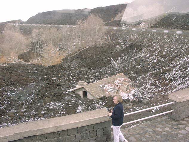 Again we exited the autostrada at Acireale, but this time headed through Giarre away from the coast. We passed through a few villages (S. Venerina, Zefferana) on the way up. It must be exciting living on the slopes of a volcano! At nearly 11,000 feet high, Etna is the highest mountain in Sicily and the highest active volcano in Europe. Tour buses, though, can only go to about 7,000 feet. As we wound our way up the mountain, we passed through lava fields from various eruptions. The most recent one leaving large fields of lava was in 1992. That lava is still very black and has no vegetation. As the fields get older, the lava starts turning red and brown and various plants grow in it. One of the more interesting sights was a house buried in lava up to the eaves. It was also fascinating to see the dozens of "flank cones." each a distinct little mountain of its own, scattered all over the slopes of Etna. Each marks a separate vent for the volcano's lava, so you never know where the next flow will be. As we approached the 7,000-foot level at about 10:00, the mountain was dusted with fresh snow, and there was slush and ice along the road and in the parking lots. Our first stop was at a large bar-restaurant where we were welcomed with free samples of two of the local liquors (one called "Fire of Etna"), as well as a delicious Easter bread. The bus then took us down a short way where we were turned loose to explore the relatively small Silvestri craters, formed during the 1892 eruption. By 11:30 we were back on the bus. By luck, we were passing through Santa Venerina at noon and got to hear the church bells making their maximum effort for Easter Sunday.