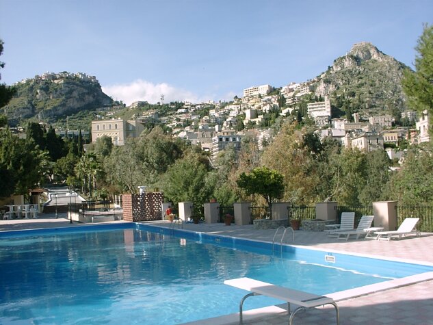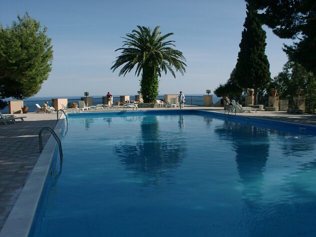 When we got to Taormina, we said goodbye to Enzo and his family. He had been a pleasant and entertaining companion for eleven days. The shuttles got us back to our hotel before 4:30, and we decided to explore (but not swim in) the hotel pool in spite of the cool, windy weather. It was a little tricky to get to, but well worth the trouble. The pool was situated on a point of rock and jutted out over the edge of the steep cliff leading to the sea. There were magnificent views up and down the coast and across to Calabria, as well as of Etna and inland toward Castelmola. We walked to the cathedral for seven o'clock Mass. It was very crowded and Darrell wound up sitting right next to the altar. We were able to understand the Passion in Italian very well, probably because we were already so familiar with it. Afterwards we went directly to La Buca restaurant for a leisurely dinner. We enjoyed walking back on Corso Umberto, window shopping all the way. By the time we got to our hotel, it was 10:00. Someone told us that there was a small eruption on Etna, visible from the hotel driveway. We could see the red glow quite well. Further to the right we saw Castelmola beautifully illuminated. [Note: About three months after our visit, there was a significant eruption of Mt. Etna, lasting several weeks and laying down major new lava fields.] Page 1 2 3 4 5 6 7 8 9 10 11 12 13 14 15 16 17
