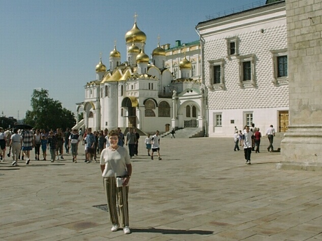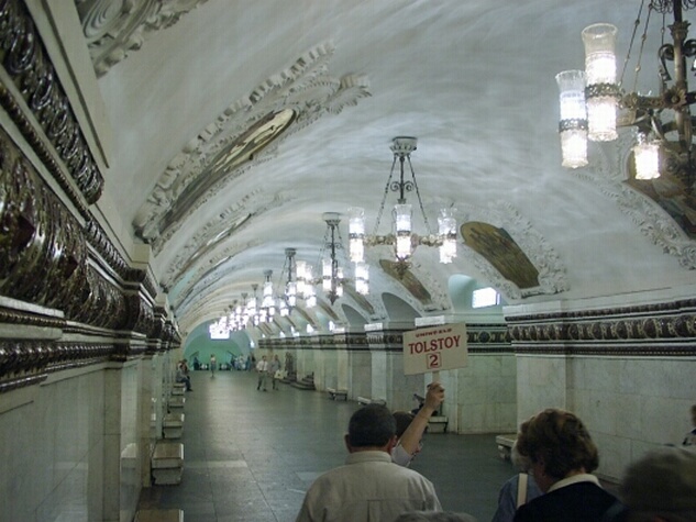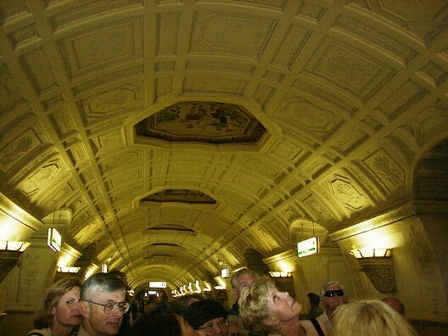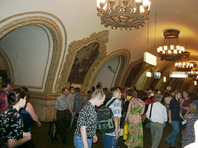 From the early 14th century until Peter the Great moved the capital to St. Petersburg in 1710, Cathedral Square was the city's principal public space and the heart of Tsarist Russia. Clustered around the square are a series of cathedrals, towers, and palaces reflecting the history of those four centuries. There are three main cathedrals, as well as other churches. (Multiple cathedrals are common at many Russian sites.) The oldest and largest is the Cathedral of the Assumption, built in the 1470s by Ivan the Great as the seat of the Russian Orthodox Church. Here all the coronations and funerals of the Tsars were held. Only a decade later, the Cathedral of the Annunciation was erected next to it. In 1508, the Cathedral of Archangel Michael was added. Unfortunately, our guide said we didn't have time to see the interiors of the cathedrals. At the foot of the Ivan the Great Bell Tower (1600), the Kremlin's tallest structure (263 ft.), we saw the 200-ton Tsar Bell (1737 - never rung). A little further on, we saw the 40-ton Tsar Cannon (1586 - never fired). There were also many old palaces now used as government offices. Finally leaving Cathedral Square, we walked back to the Armory. The present Armory building (1851) replaced a 16th century factory for making weapons and armor. Hence the name. But the Armory is, in fact, a large museum housing a vast collection of Russian national treasures and historical artifacts. There were weapons and armor, clothing, dishes and goblets, religious items, coaches, crowns, thrones, jewelry and, of course, Faberge eggs (one with a complete trans-Siberian train inside, made of gold and platinum). We spent about an hour in the museum and only saw a small fraction it. The bus got us back to the Tolstoy for lunch at 1:30. We had signed up for an optional tour of Moscow's famous Metro (subway) stations, leaving by bus at 3:00, and it was a rush to make it. It also was a mistake to sign up because Jane was already exhausted, and we easily could have seen the subway stations on our own when we had more time. Anyway, the finest stations are the oldest ones, opened in the 1930s. Our bus took us to the Belarus railway station where we caught the first subway train. We visited four different stations, each decorated in a different style with stained glass, murals, mosaics, sculpture, and fancy chandeliers. They were attractive for subway stations but definitely showed a Stalinist touch.