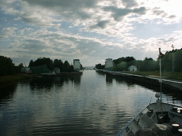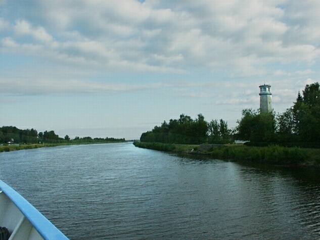 Wednesday, 17 July. When I got up at 7:30 a.m. and looked out our cabin window, the boat was just passing the 160 km. marker. During the night we had passed through four more locks (#5, 4, 3 & 2) of the Moscow Canal and were just crossing the Sestra River, which flows under the canal. I was on deck in time to take a photo of the Big Volga Lighthouse (not so big) and watch as we approached a large statue of Lenin. The boat entered Lock #1 which would lower us 36 feet into the mighty Volga River (@km 165). At 2,300 miles, the Volga is the longest river in Europe. We had breakfast at 8:00, followed at 9:00 by an outstanding lecture by Professor Andjaparidze on "The Current Political Situation in Russia." Judging by the Professor's frank and outspoken remarks, freedom of speech has definitely arrived in Russia. He was followed at 10:30 by an excellent lecture on Russian art (black lacquer boxes) by the two young women who ran the Tolstoy's gift shop. This was followed by an orientation on the optional tours available in St. Petersburg, and then by lunch.