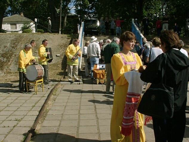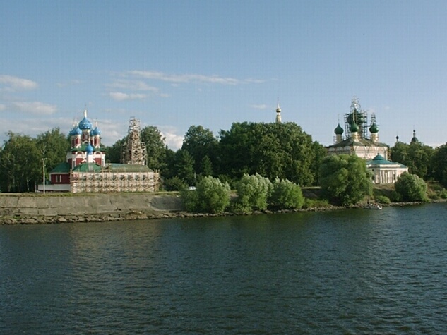 Passing through the dam's lock, capped by a triumphal arch celebrating Russia's victory in World War II, the boat arrived at the city of Uglich at 4:00 (@km 312). Because its kremlin walls have been torn down, there was a good view of the churches there from the river. We debarked for the shore excursion soon after docking and were met by a band and by a woman offering us cake (to be broken off with the fingers) as a sign of hospitality. In addition to its beautiful setting on the bank of the Volga, Uglich, now a city of 39,000 residents, has a colorful history. It was a favorite of Ivan the Terrible. Upon Ivan's death in 1584, his son and heir, Dmitry, was sent to live here. When he was nine, he was murdered by Boris Godunov's men in a successful effort to seize the crown. On the bloody spot where the murder took place, the city built the magnificent Church of St. Dmitry on the Blood. Our excursion was a walking tour since the old kremlin was so close to the dock. We had to pass through the usual gauntlet of vendors along the way. Arriving at the kremlin, we visited the Palace of the Princes, built in 1480 but much modified over the years. We couldn't go into the Church of St. Dmitry because it was being renovated, but we toured the larger Transfiguration Cathedral. On two sides of the ornate interior, there were art galleries. A male choir performed for us in the church, and their singing was excellent. We learned that the singing in Orthodox churches in Russia is generally done by professionals retained specifically for that purpose.
