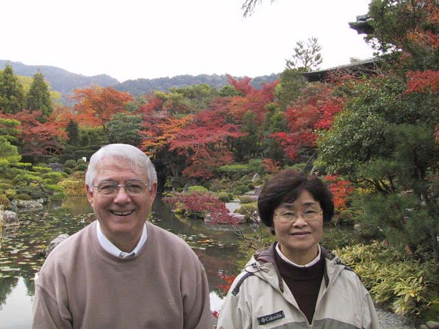 Because our flight from Washington's Dulles Airport was so early (7:30 a.m.), we made the two-hour drive from our house the evening before. That also allowed us to leave our car at the Fairfield Inn for the three-weeks. The savings on parking easily offset the cost of the motel. Wednesday, 9 October. We were up at 5:00 a.m., had breakfast at the motel, and caught their shuttle to the airport. The United flight was on time and arrived in San Francisco at 10:00. We boarded our plane to Osaka at 11:30, and that's when the "fun" began. It was supposed to depart at 12:10, but it didn't. We finally deplaned at 2:30 p.m. while United continued to try to fix a mechanical problem. (One of the engines wouldn't start.) We sat around the airport another couple of hours before they finally canceled the flight, rescheduling it for the next morning. We were given meal vouchers and shuttled to a Best Western motel for the night. By a stroke of good fortune, Jane started a conversation with the couple behind us as we waited to check into the motel. The wife was going to phone her mother, who lived in Osaka, about the delay, and volunteered to have her mother call Tom. A short time later, Tom called our room to verify our arrival time. We were in bed at 8:00 p.m. (but 11:00 EDT, our regular bedtime). In a way, the overnight delay in San Francisco was beneficial in that it broke up the long flights from Washington to Osaka. However, we could have done without the several hours we spent at the airport before going to the motel. Also, of course, we lost a full day in Japan. Thursday, 10 October. Another early start. We were up at 5:30, ate a light breakfast at the motel. (We were able to give half the food vouchers we'd received from United to a couple of Navy men with bigger appetites.) The flight to Osaka, on a replacement plane, pulled away at 9:20. The 11-hour flight was uneventful, other than a little bumpy weather. We crossed the International Date Line in mid-Pacific, making it Friday. Friday, 11 October. We landed at Osaka at just after noon. The immigration procedure was surprising slow for any country, but especially for a modern developed one. We can only compare it to our experience in Moscow. Of course, we would pick the slow line. Other people who arrived 40 minutes after we did were through before us. By the time we got through immigration, the remaining luggage from our flight had been removed from the carrousel, and we had trouble finding it. After this inauspicious start, it was great to see Tom as we finally emerged, 90 minutes after landing. With his help, we shipped our one large suitcase to his home, validated our rail passes, and caught the 2:18 express train to Kyoto. There we transferred to a local train that took us the few miles to the Hieizan-Sakamoto station. We took a taxi a few blocks to Tom's apartment, arriving before 4:00 p.m. We unpacked, rested, ate, and were in bed by 9:00. Considering the 13 hour time difference between Virginia and Japan, we were bearing up remarkably well, thanks largely to the layover in San Francisco. (Incidentally, Japan does not observe daylight saving time.)
