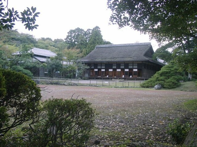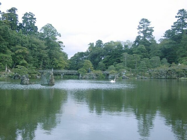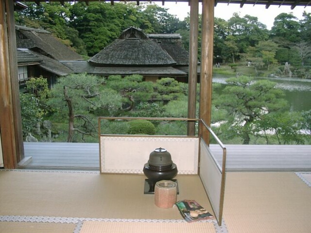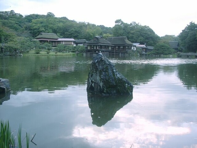 After exploring the rest of the area around the tower, we walked back to the entrance. As we crossed the moat where the old man had greeted us, there he was again. This time he came up to Jane and presented her with a small origami boat he had made from a large leaf. It was already 4:30 and we had forgotten that the castle had a garden, too. We found that it was still open and rushed over to try to see it. The garden was built around a small lake. On the near side was a group of buildings, including a tea house. Tom and Kyoko decided to have tea there, and Jane stayed with them. I left to see the garden before it got too dark. It was a beautiful and peaceful setting. The castle's main tower was easily visible from almost every spot in the garden. I even came across the 17th century residence of a samurai. When I got back, the others were waiting, and we took a taxi back to the Hikone train station. We had dinner across the street from the station, then took the train back to Sakamoto, arriving about 7:30.
