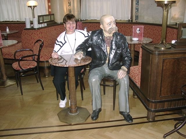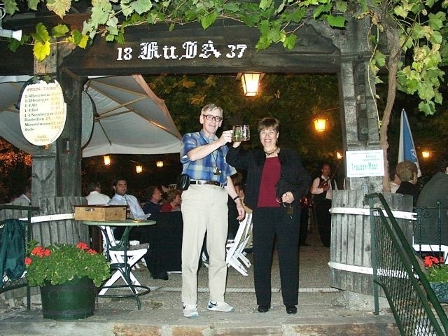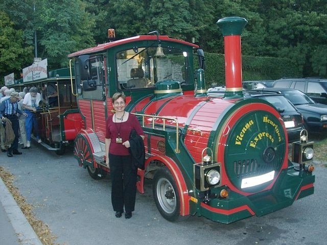 Continuing on to the river, we caught the subway at Schwedenplatz, getting back to the hotel about 3:30. We just had time to get ready for the 5:15 bus departure for our ride to the Vienna Woods. We drove north, near the Danube, to the small town of Kahlenbergerdorf where we boarded the "tschu-tschu" train. This was a rubber-tired miniature train that traveled on the road. It took us up a narrow winding road to the top of the Kahlenberg, a small mountain, where we got off and walked a short distance to an overlook with a great view of Vienna and the Danube. The "tschu-tschu" then took us back down, and we boarded the bus again. It was a short ride to the Grinzing district where we were to have dinner at the Weinbotlich, a Heuriger (a casual vintners' tavern required to serve its own young, homegrown wine). We ate outside in the garden, enjoying the beautiful short-sleeve weather. Then it was back on the bus for the ride to our hotel. We arrived about 10:30. We were going to visit the Melk Abbey tomorrow, originally planning to go by train from the nearby Westbanhof. But we checked at the hotel desk to see if they could get us on a tour to the Abbey. We booked one that included a boat ride through the lovely Wachau Valley ending at Melk.