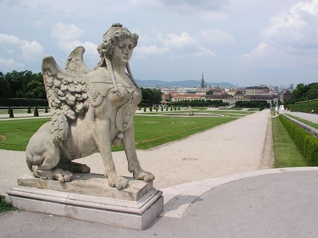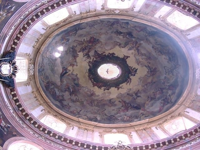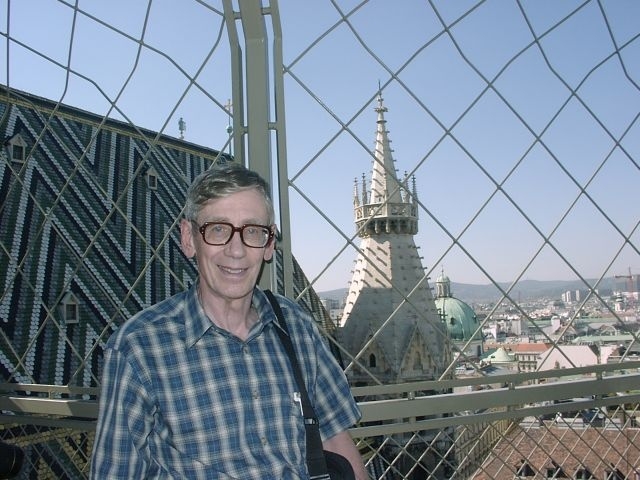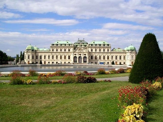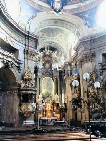 Janet then led us on a walking tour of the old city center. It was a charming area. We stopped at the Graben, a rather ugly monument to Vienna's survival of the plague. We had a nice view of the Hofburg's Michael's Gate down one of the narrow streets as we headed for the Café Central, one of Vienna's old coffee houses, located in the Palais Ferstel. After relaxing a while over coffee and cake. We resumed our walk. We came to Michael's Gate and stopped at the Roman ruins in the square. We past the Spanish Riding School and its museum, and came to Josefsplatz with its large equestrian statue of Kaiser Josef II in front of the National Library. Eventually we found our bus near the Albertina and got on board for our visit to the Belvedere Palace. There are actually two palaces, the Lower Belvedere (1714) and the Upper Belvedere (1721), but the upper one is the more magnificent. We remembered this beautiful palace from our 1961 visit. Built by Prince Eugen of Savoy on a gently rising hill, it still commands a striking view of old Vienna. We had time for a brief walk around the garden before the bus took us back to the hotel around noon. After a quick lunch, Jane and I took the subway to Stephenplatz for a more leisurely stroll around the old city. We spent some time looking over the interior of the church, then took the small elevator (at the pummerin) to the roof. There was a great view of the old city. Leaving St. Stephen's, we walked to the nearby Peterskirch (1708), renowned for its sumptuous baroque interior. It was being renovated, though, and much of it was hidden by construction curtains.