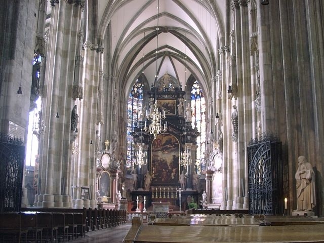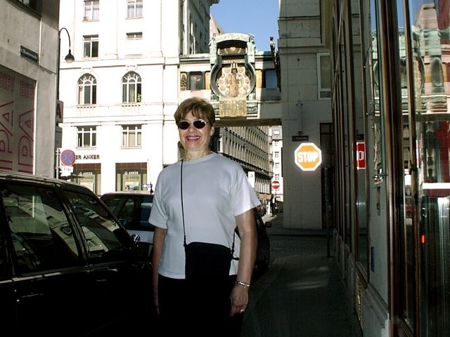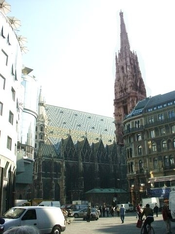 Rathaus (1883) was equally impressive. HELLO as it passes Vienna. This canal is called the Danube River, while the original river bed through the city, We continues past the Votive Church, then followed the "original" Danube for several blocks. As a flood control measure, most of the Danube's waters are confined to a straight and relatively unattractive canal now only a small stream, is called the Danube Canal. The bus then turned back towards the old city center and dropped our group at Stephenplatz, site of Vienna's landmark St. Stephen's Cathedral. This is supposed to be a pedestrian zone, but deliveries are allowed for most of the morning hours. It seemed very hazardous with all the trucks and cars zooming through the mobs of tourists.