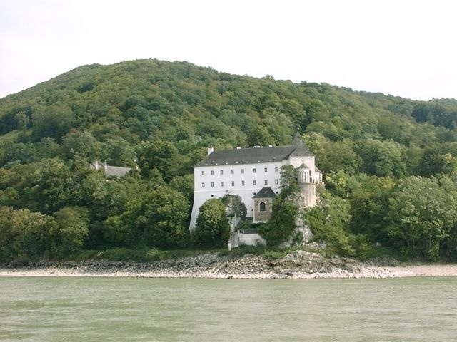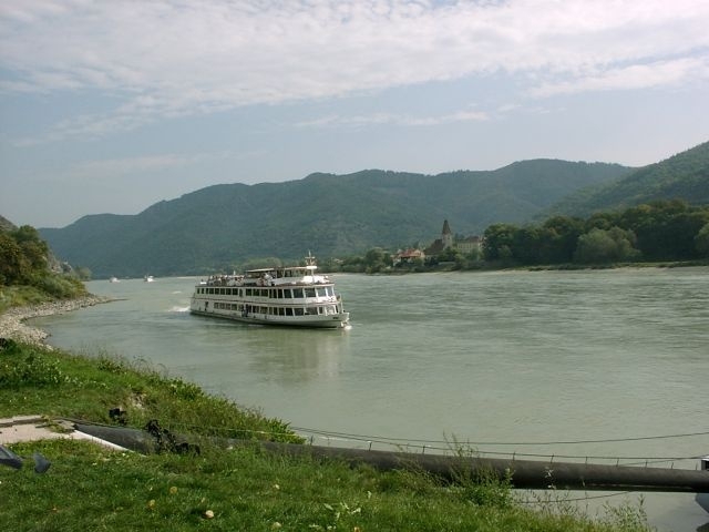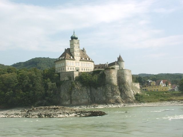 The river boat Prinz Eugen came about 30 minutes later and our tour group joined the passengers who were already on board. The Wachau is an especially beautiful stretch of the Danube, with vine-covered hills, picturesque villages, and a sprinkling of interesting old buildings. Some, like the hilltop castle ruins of Aggstein and the palace (schloss) at Shoenbuhel, are relatively well known, while others we never did learn the names of.