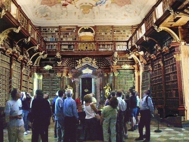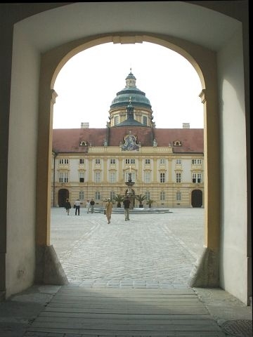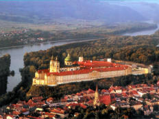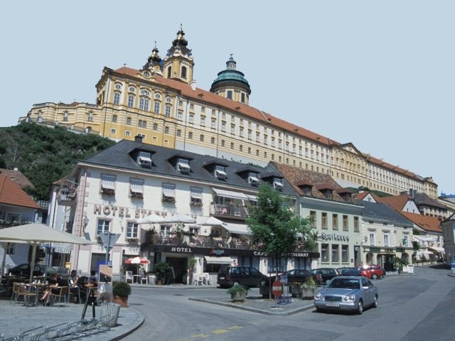 The tour was excellent and, even disregarding the splendid trip through the Wachau, the Abbey was well worth the trip. The tour took us through the Prelates Courtyard and into the Imperial Gallery (Kaiserzimmer) side of the Abbey. We could see immediately why the Abbey is often called the finest example of baroque architecture in Austria. There were lavishly decorated rooms once used by the royal family. The last and probably the finest room on this side was the Marble Hall, decorated with red and gray Salzburg marble. The ceiling, covered with an allegorical fresco, seemed to curve up steeply from the sides. Even when our guide told us that the ceiling was really flat, it was hard to believe. We exited from Marble Hall onto the large outdoor Terrace in front of the Abbey church. There was a great view of the Danube, the town of Melk, and the surrounding countryside.