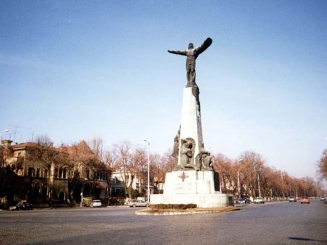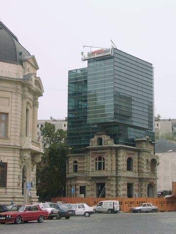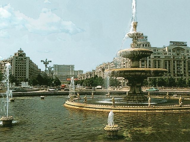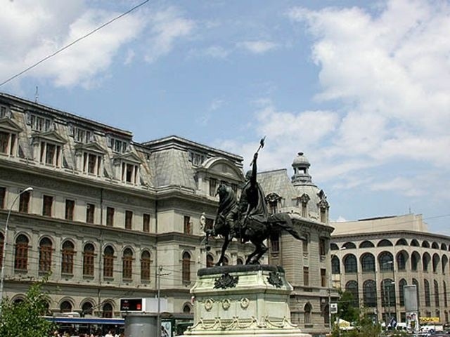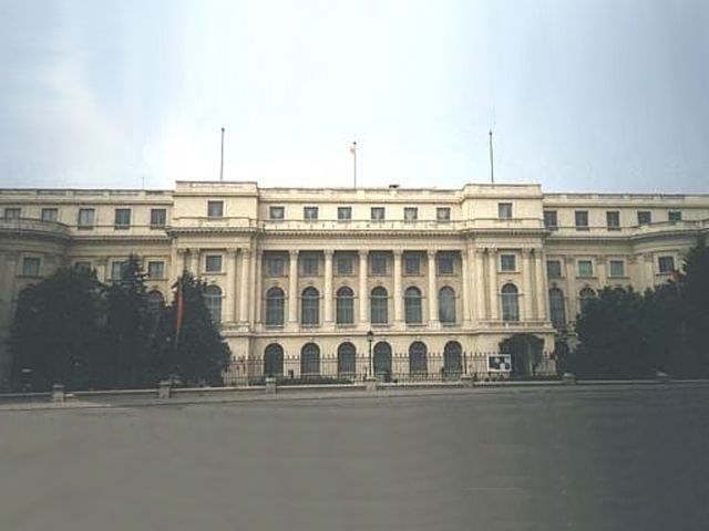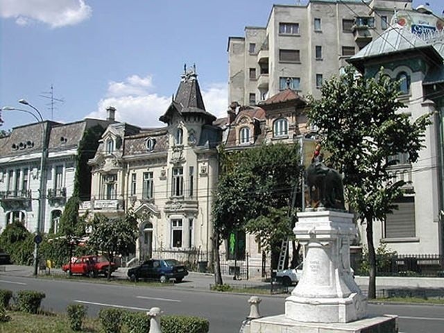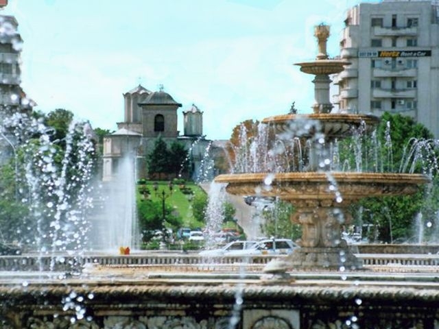 We then continued west to Unification Square with its many fountains. There was a good view from there up the Boulevard to the Parliament Building, and the Romanian Orthodox Patriarch's church (Mitropolia) and palace were just off the Square. We drove south through University Square and by the National Theater. We passed through Roman Square, with a statue of the she-wolf nursing Romulus and Remus. We turned south at Victory Square and went by the Air Heroes' Memorial (1935). Turning back toward town, we passed the Arch of Triumph, Media Square, the Enescu Music Museum, and finally stopped at Revolution Square where we saw the former Royal Palace (last reconstructed in the 1930s), now the National Art Museum. It was on a balcony of this building that Ceaucescu was making a speech when the revolution that overthrew him in December 1989 began.